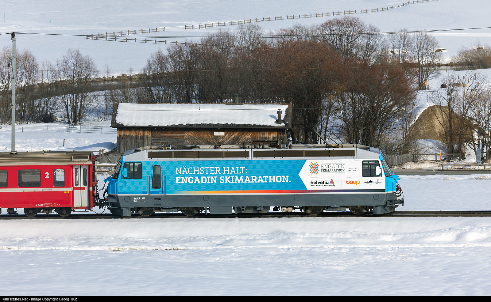 | The Ge 4/4 III # 649 of the Rhaetian Railway has a new publicity paint scheme (foils) for the Engadin Skimarathon. The locomotive is shoving the IR 1152 of the line IR38 from St.Moritz over the Albula line to Chur, between Celerina and Samedan. |