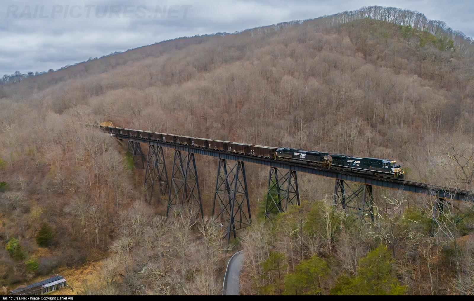 Loaded rock train NS J40 crosses over the massive trestle in Hardy, WV along the Princeton Deepwater District.