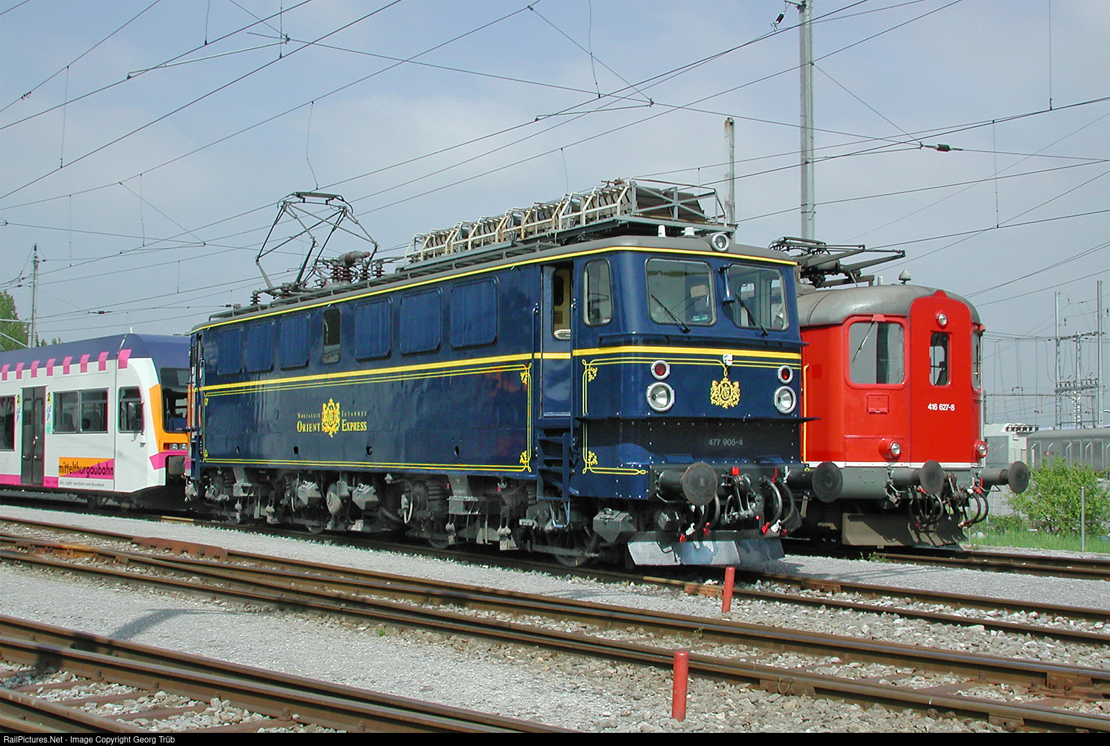 In front of the shed in Weinfelden is standing the blue Ae 477 # 905 of the Lokoop in the special paint scheme for the Nostalgie Istanbul Orient Express (NIOE) of the Reisebüro Mittelthurgau. The locomotive was built by the LEW Hennigsdorf as 242 # 191 for the Deutsche Reichsbahn of the German Democratic Republic (GDR) in 1971. Bought by the Mittel-Thurgau-Bahn (MThB) in april 1994 (together with 17 others of this type) for free acess freight trains in Switzerland. Adapted for running in Switzerland with an electric brake, train protection system and multiple control system IIId by Stadler in Busnang. Then taken over by the daughter compagny Lokoop and designated Ae 477 # 905, with this new paint scheme. After bankrupt of the Lokoop (and MThB) in autumn 2002 the locomotive came to the SBB, but was stabled in Frauenfeld, Weinfelden Süd and later Etzwilen. In 2003 sold to the german Westfälische Almetalbahn (WAB) as # 55, since 2015 owned by Deutsche Privatbahn GmbH and stabled in Wittenberge today. On the right is the red Re 416 # 627 of the Mittel-Thurgau-Bahn, former Re 4/4 I # 10016 of the SBB, built in 1945 by SLM, BBC and MFO, On the left is a articulated lowfloor diesel railcar Bm 596 # 67. of the Mittel-Thurgau-Bahn, built by Stadler, SLM and Adtranz in 1996 and used on the Radolfzell-Stockach line in Germany for the "Seehäsle".