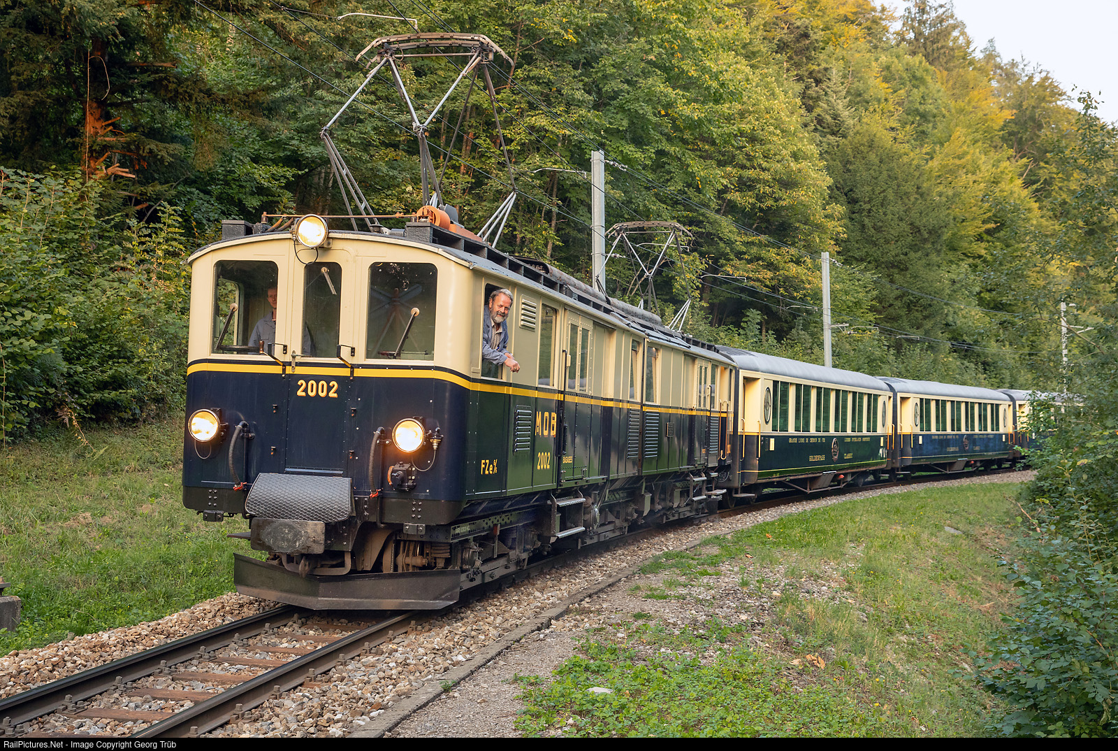 Heavy articulated railcar with baggage and mail compartment FZe 6/6 # 2002 of the Blonay-Chamby Railroad Museum (BC) with a GOLDEN MOUNTAIN PULLMAN EXPRESS on the MOB line between Sendy-Sollard and Chamby. This sixaxle 810 kW railcar was built by SIG and BBC in 1933 for the Montreux-Oberland-Bernois (MOB), to pull the "Golden Mountain Pullman Express" between Montreux and Zweisimmen and vice versa. This train was introduced in may 1931, but cancelled already in the autumn of the same year because of the world economy crisis and lack of passengers. So in fact this railcar never pulled the timetabled Pullman Express, but there were made some publicity photos in the 1930' with this composition. In the evening of the 8th september 2017, such a train was arranged for photographers by the MOB (4 Pullman cars) and the Blonay-Chamby (railcar FZe 6/6). The railcar # 2002 is running for the BC since 2008 and is beautyfully restored. The 4 cars of the MOB are not original, but modern rebuilts in the appearance of the cars from the 1930'.
