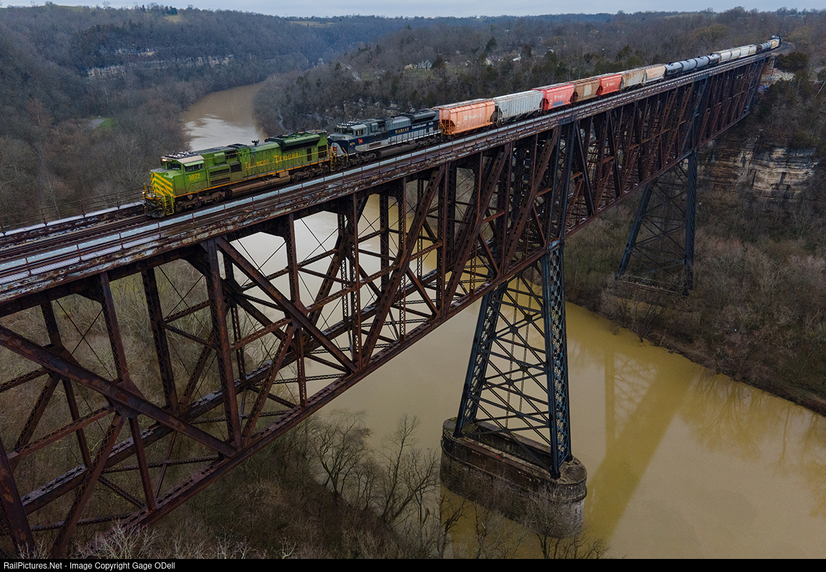 With a light rain starting to fall, NS 143 crosses the Kentucky River and through the famed High Bridge behind the Illinois Terminal and Wabash heritage units on the front