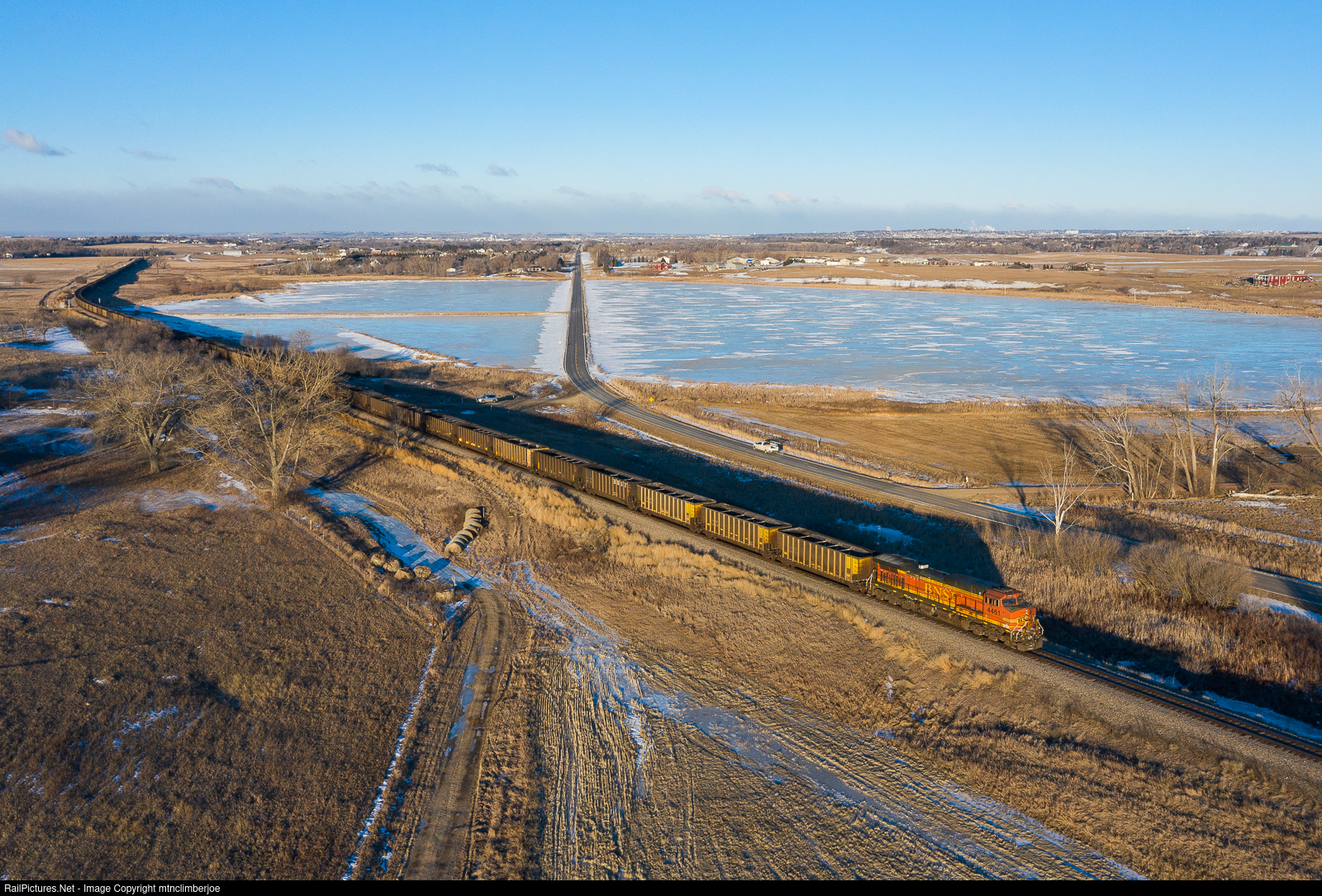 A BNSF C44-9W brings up the rear of an empty coal train as it heads back to the mines on a frigid March day. The train is rolling past the frozen lakes at the Bryan Mohler Waterfowl Production Area in Apple Creek, North Dakota as it approaches Bismarck.