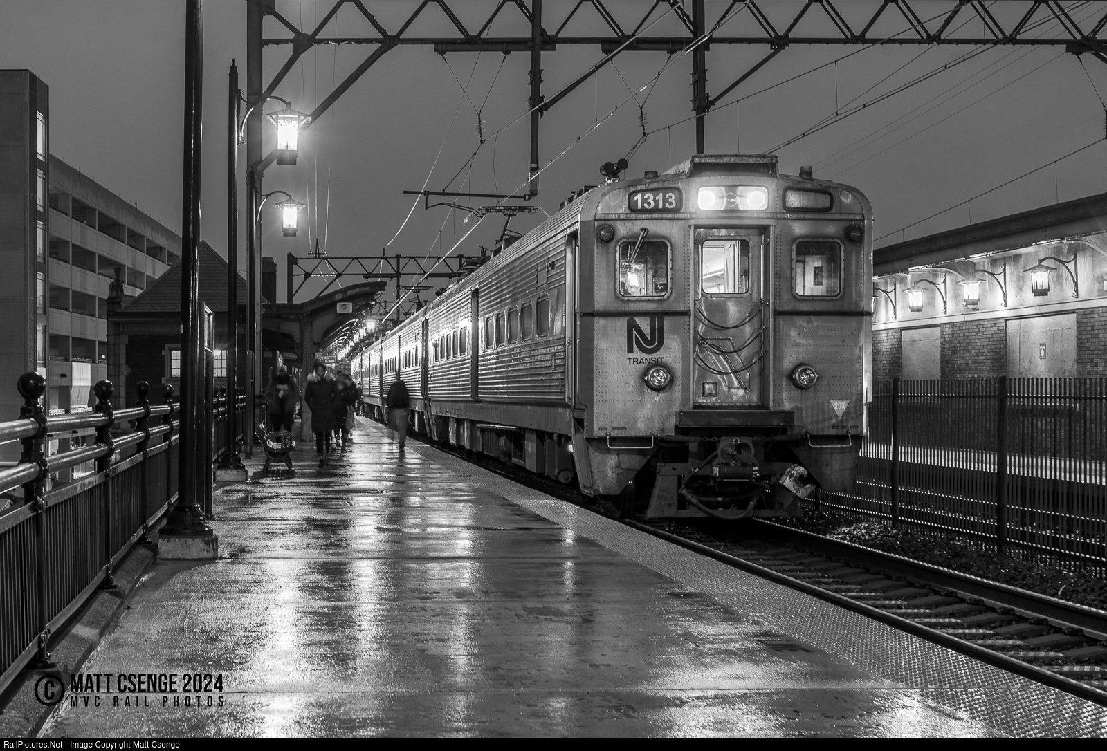 With water from the day's rainstorm still puddled on the platform, NJ Transit Arrow III no. 1313 is seen making its station stop at Brick Church Station, operating as Morristown Line train 337. |