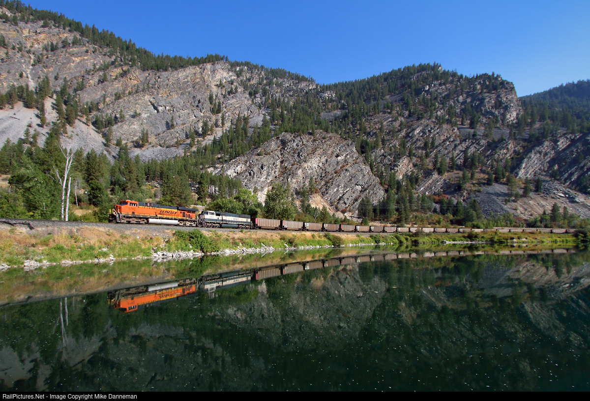 | A westbound BNSF coal train arcs along the riverbank of the Clark Fork between Thompson Falls and Eddy, Montana, on September 19, 2012. |