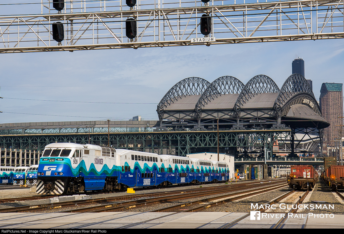 Stadium Signals. Sound Transit/Sounder Commuter Rail F59PHI SDRX 909 (EMD, 1998–2001) is laying over next to Safeco Field in Seattle, Washington as seen from South Holgate Street on the morning of September 2, 2008. The railroad part of the scene is largely unchanged today, though the home of the Seattle Mariners is now called T-Mobile Park. After receiving a mid-life overhaul by EMD, the eleven F59PHIs (901-911) continue to serve to this day. In 2019, ridership was reported to be 4,616,656 on the two lines, a more than 500% increase over 2004, the first full year that both the S and N lines were in operation.