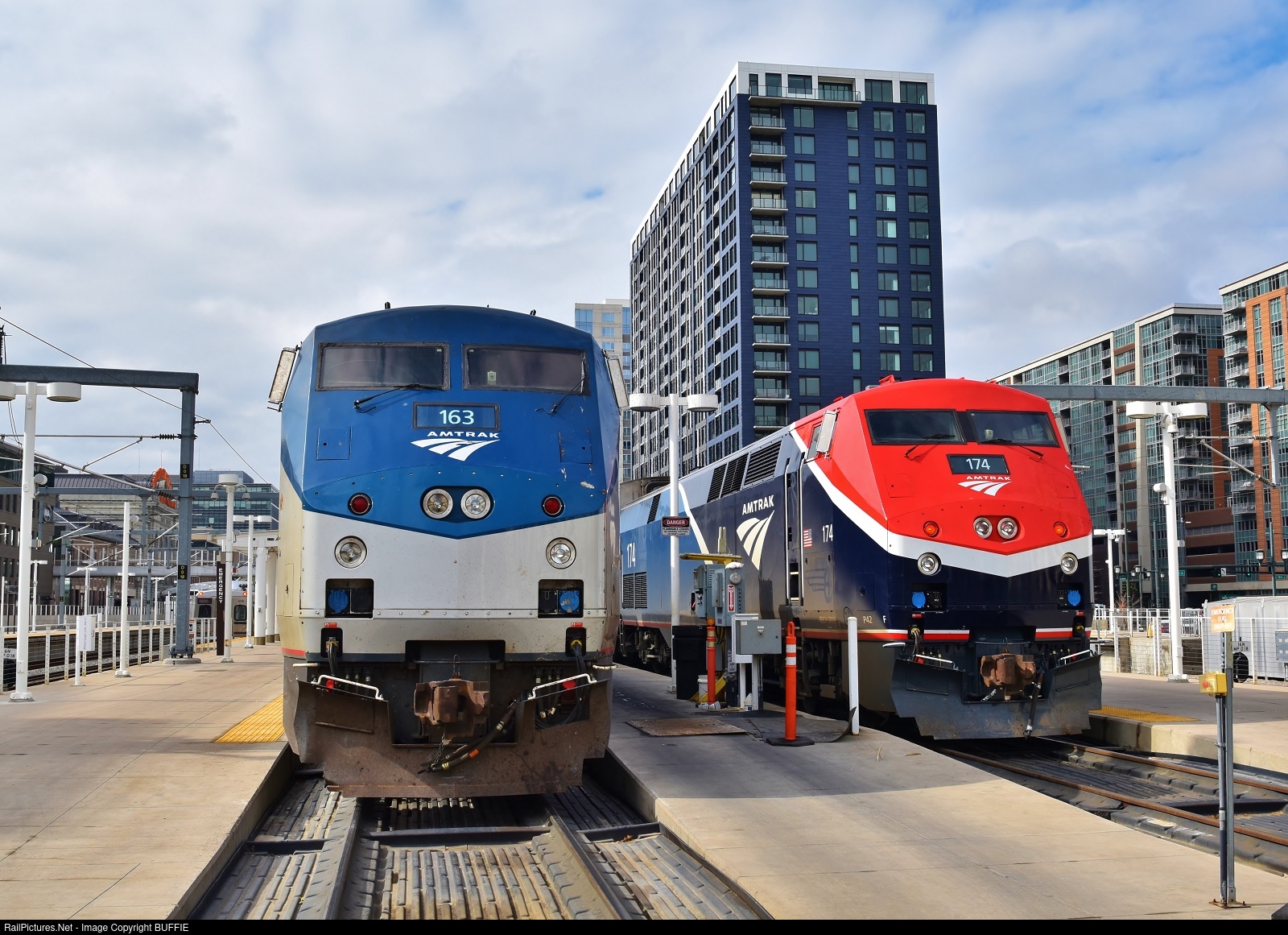| A pair of Amtrak trains sit on tracks 4 and 5 at Denver's Union Station. Amtrak engine #163 (P42DC) will leads the California Zephyr 6 out of Denver and Amtrack engine #174 will lead the Colorado Governor's Special on a rare trip up the Front Range Sub to Longmont, Colorado.