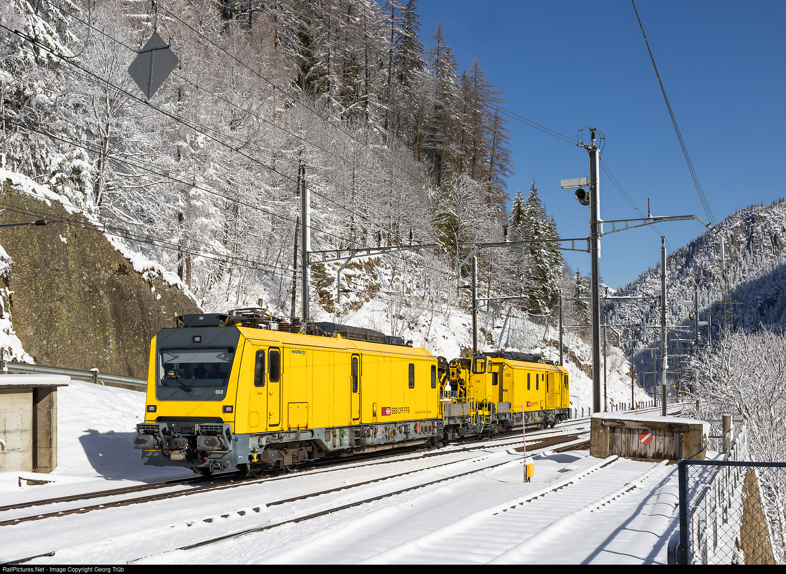 | Dual power electro/diesel vehicles Xem 181 # 003 and # 010 of SBB infrastructure in multiple control are leaving Göschenen for Erstfeld, probably for driver training. This vehicles with 1500 kW when driving from the overhead wire and 750 kW with diesel power were built by Harsco Rail for the maintenance of the Gotthard and Ceneri Base Tunnels and are based in Erstfeld and Biasca. They can be seldom see on the Gotthard mountain line. |
