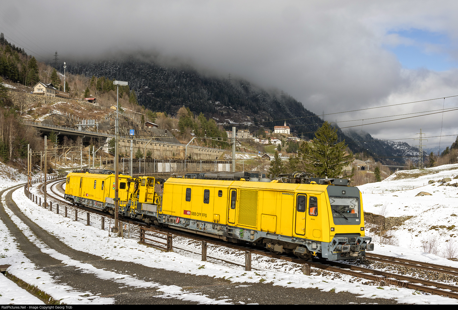 Dual power electro/diesel vehicles Xem 181 # 003 and # 010 of SBB infrastructure in multiple control are running down the Gotthard mountain line between Wassen and Gurtnellen, probably for driver training. This vehicles with 1500 kW when driving from the overhead wire and 750 kW with diesel power were built by Harsco Rail for the maintenance of the Gotthard and Ceneri Base Tunnels and are based in Erstfeld and Biasca. They can be seldom see on the Gotthard mountain line.