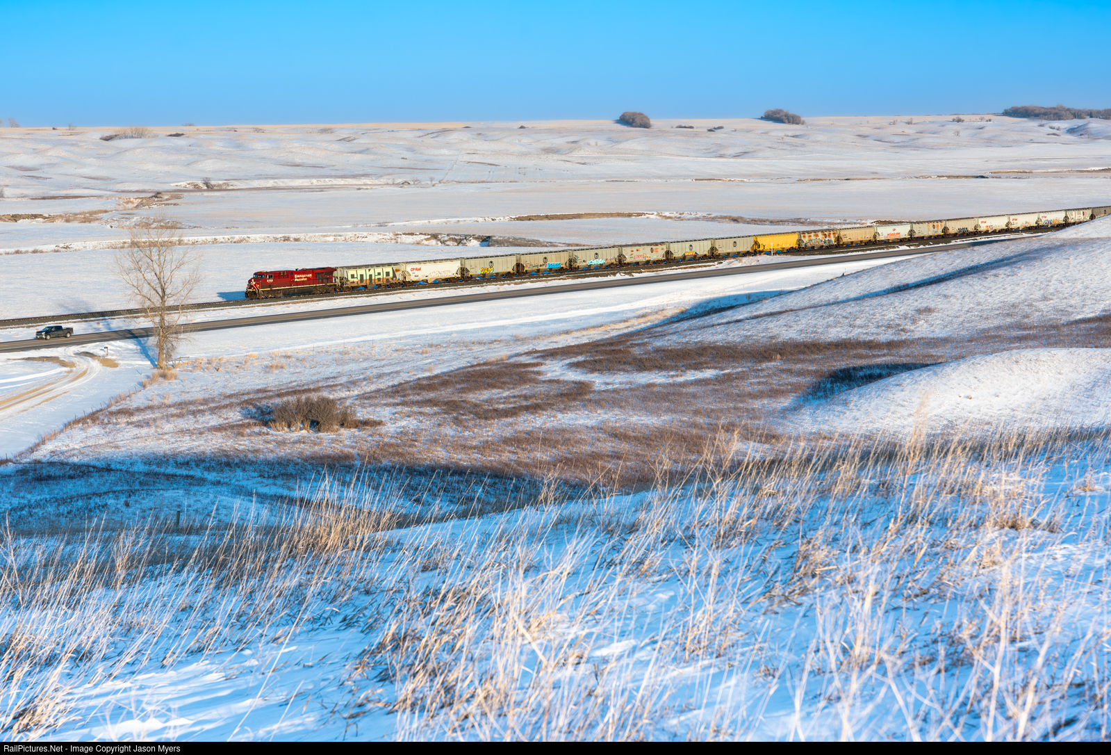 | An evening CPKC grain train glides westward through the Mouse River Valley along the Portal Subdivision. Most locomotives are ex-CP still, but some KCS locomotives have shown up as mid-train DPUs. |