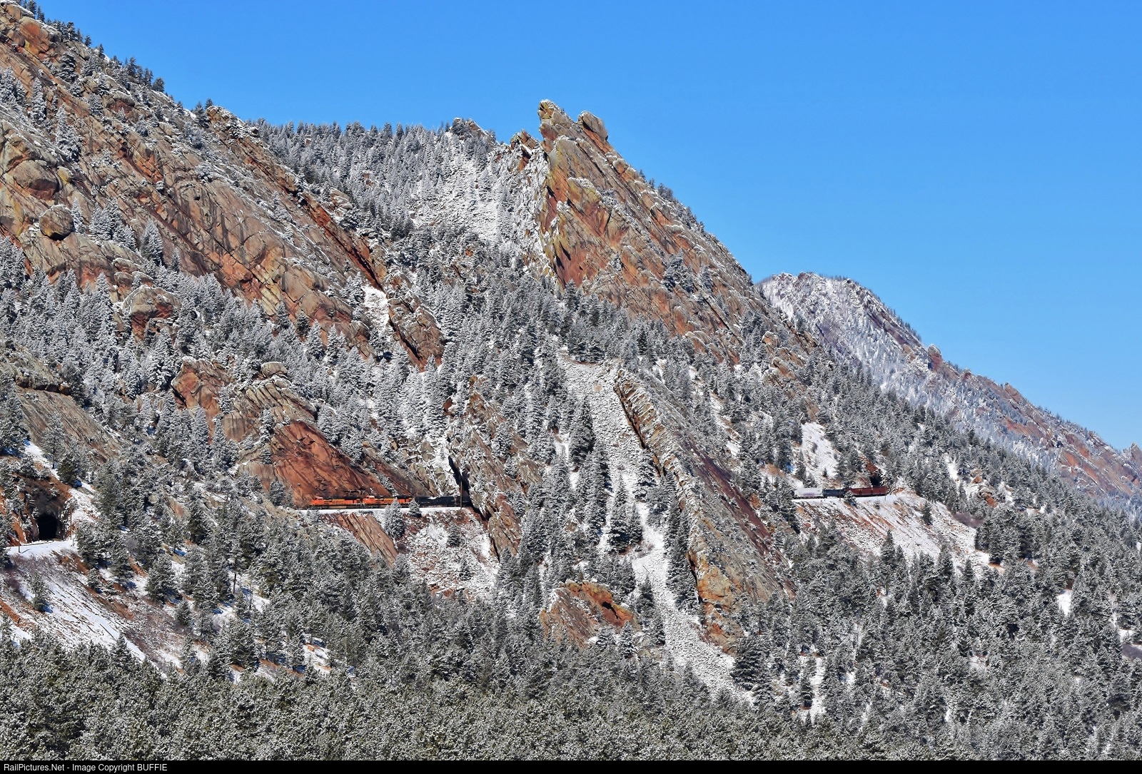 A BNSF freight runs through Tunnel #4 at Plainview, Colorado after the night's snow frosted the foothills on the Moffat Tunnel Sub.