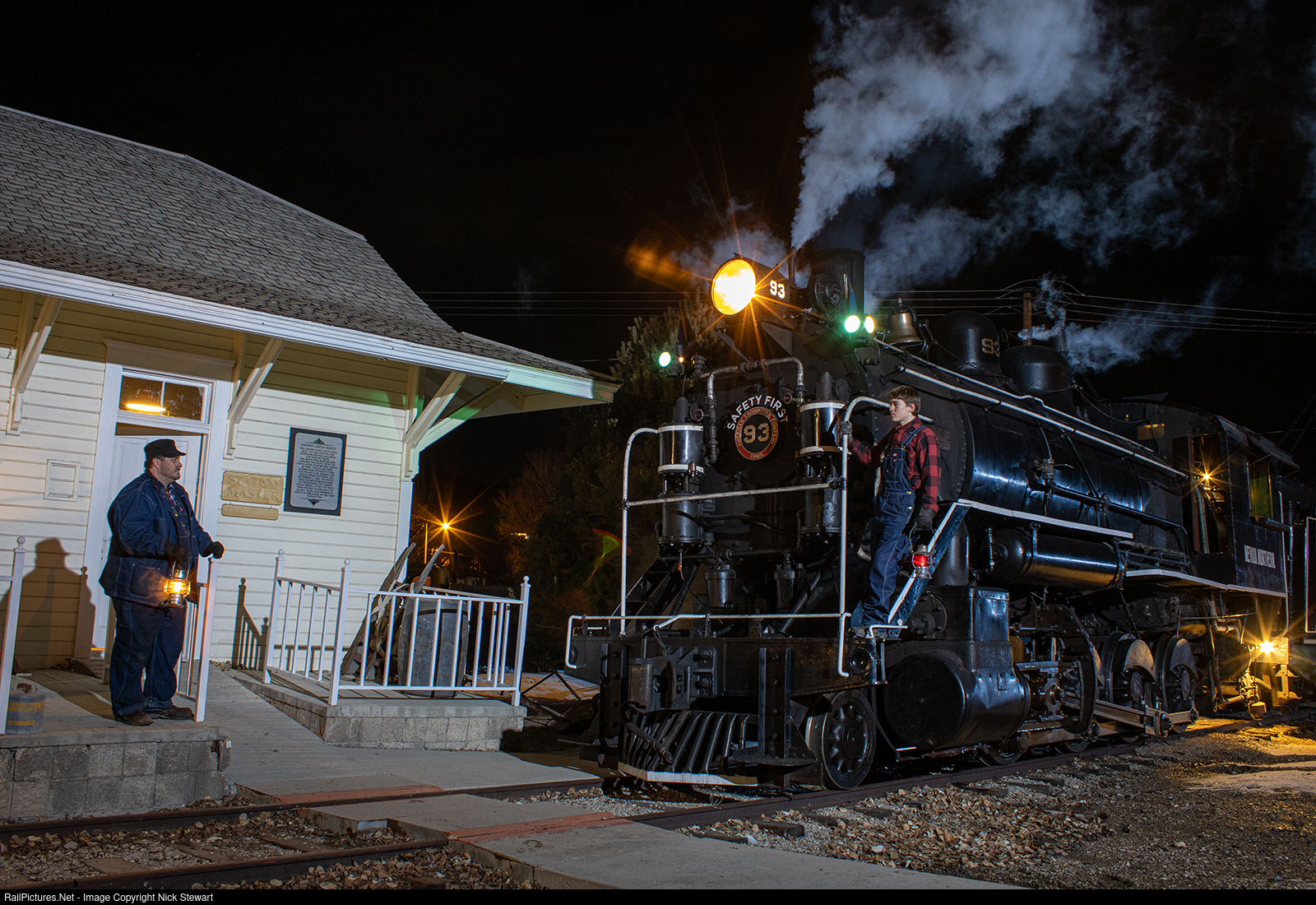 | Nevada Northern 93 poses next to the Cherry Creek depot, located west of the East Ely Yard for a night photoshoot during the first Winter Steam Photo Weekend of 2024. This is the first time the Nevada Northern has held the night photo session at the Cherry Creek Depot. |