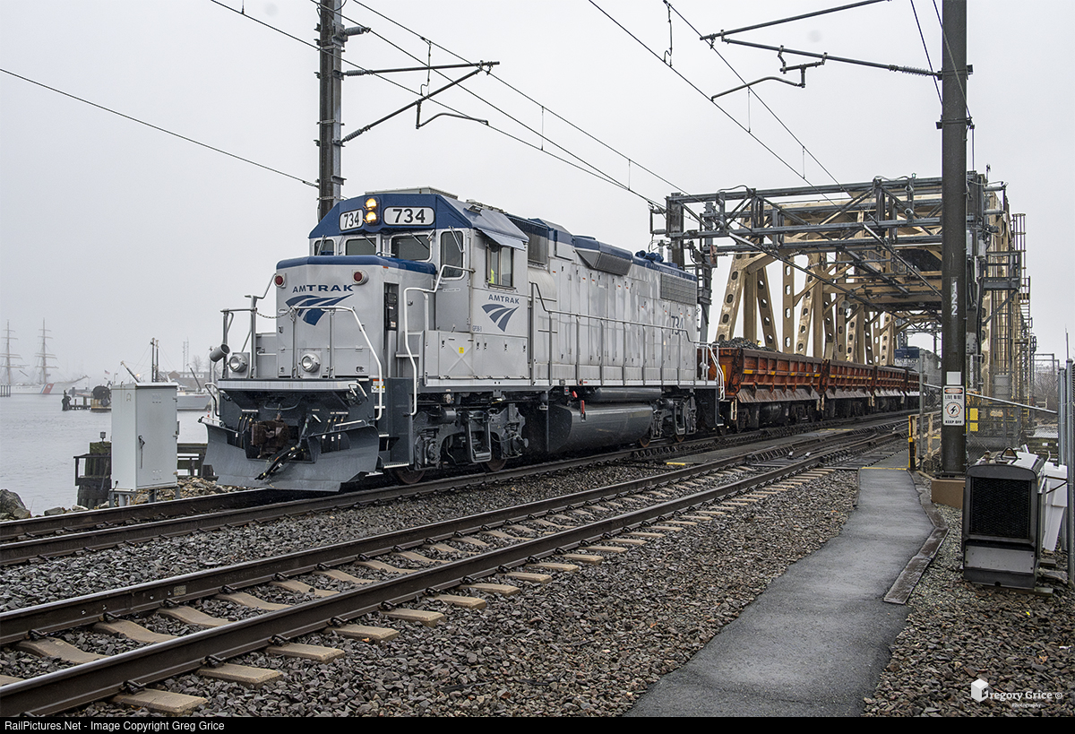 On the rainy afternoon of March 5th, 2024, Amtrak EMD GP38-3's 734 & 728 double end a small consist of loaded side dump cars on "Amtrak Extra 734" as it crosses Shaws Cove Bridge in New London, Connecticut. 734 (ex LI 263) & 728 (ex LI 253) are two of 36 newly rebuilt EMD GP38-3's purchased from Progress Rail to replace the aging MP15DC work locomotive fleet.
