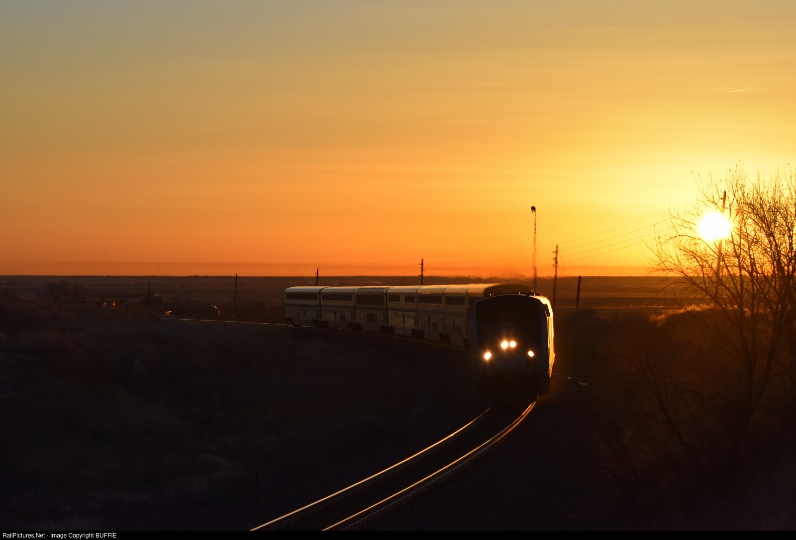 The California Zephyr 5 train races the sunrise through Keenesburg, Colorado as it heads to Denver on the Brush Sub.