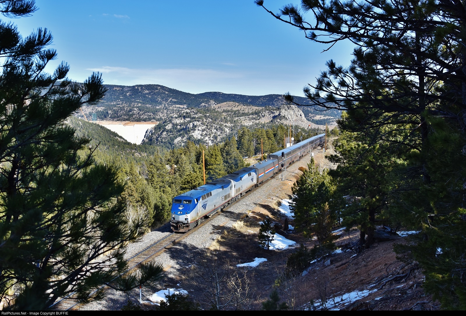 | After leaving Denver, Colorado, the California Zephyr 5 train runs through Crescent and past the Gross Reservoir dam.