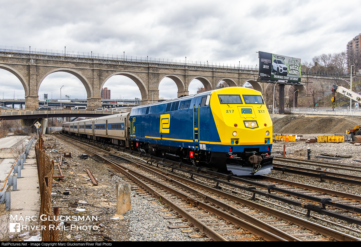 Metro-North's Fourth Heritage Unit. MTA Metro-North Railroad 217 (Penn Central Heritage) made its revenue debut in its new colors on Train 734 on Monday, March 11, 2024, seen passing under the High Bridge in the Bronx New York. For the occasion, as has been done with the previous three, the set was turned for the locomotive to face south/east. This unit commemorates the New York State/Penn Central paint scheme used on FL9s during this era as part of Metro-North's ongoing 40th Anniversary celebrations, it's fourth wrap that joins the four Connecticut DOT New Haven tribute units. Penn Central's interlocked "PC" was commonly called "mating worms" From February 1, 1968 to April 1, 1976, Penn Central Railroad bridged the gap between New York Central and Conrail as the operator of today's Metro-North east of Hudson New York State Lines, and it was the inclusion of the New York, New Haven, and Hartford Railroad in 1969 that brought FL9s to the Hudson and Harlem Lines for the first time in revenue service.