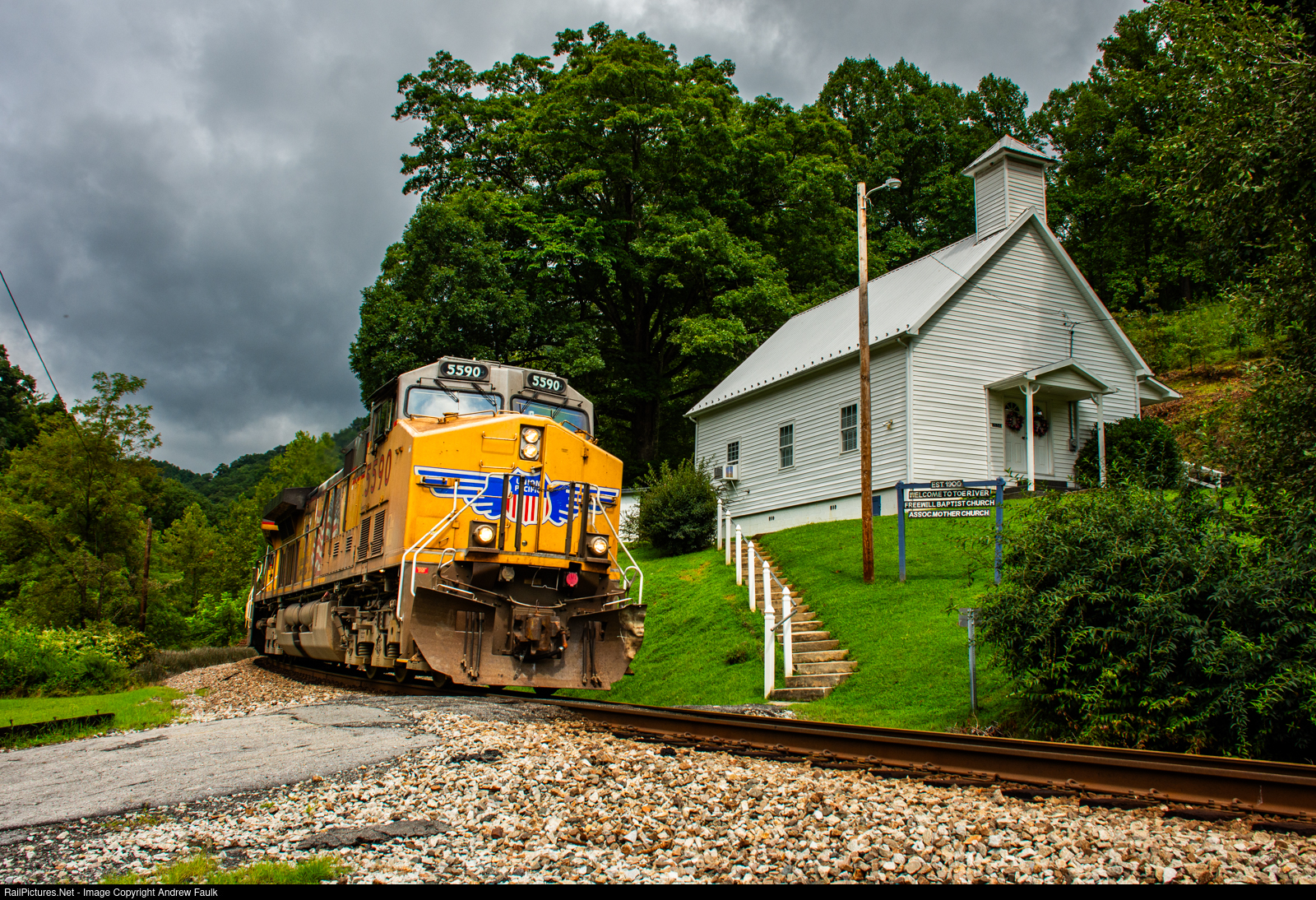 A trio of UP power leads Q693 by the classic Clinchfield scene at the Huntdale church.