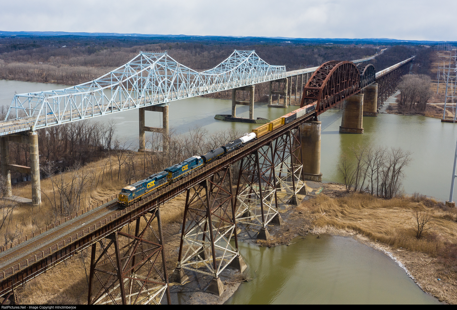 | Soaring high above the Hudson River in Castleton-On-Hudson, New York, a pair of GEVO's lead CSX M205 over the Alfred H. Smith Memorial Bridge as the train approaches Selkirk Yard. Running primarily as an empty auto train, there is a block of manifest on the head end that was picked up in Springfield and will be switched out while working in Selkirk. |