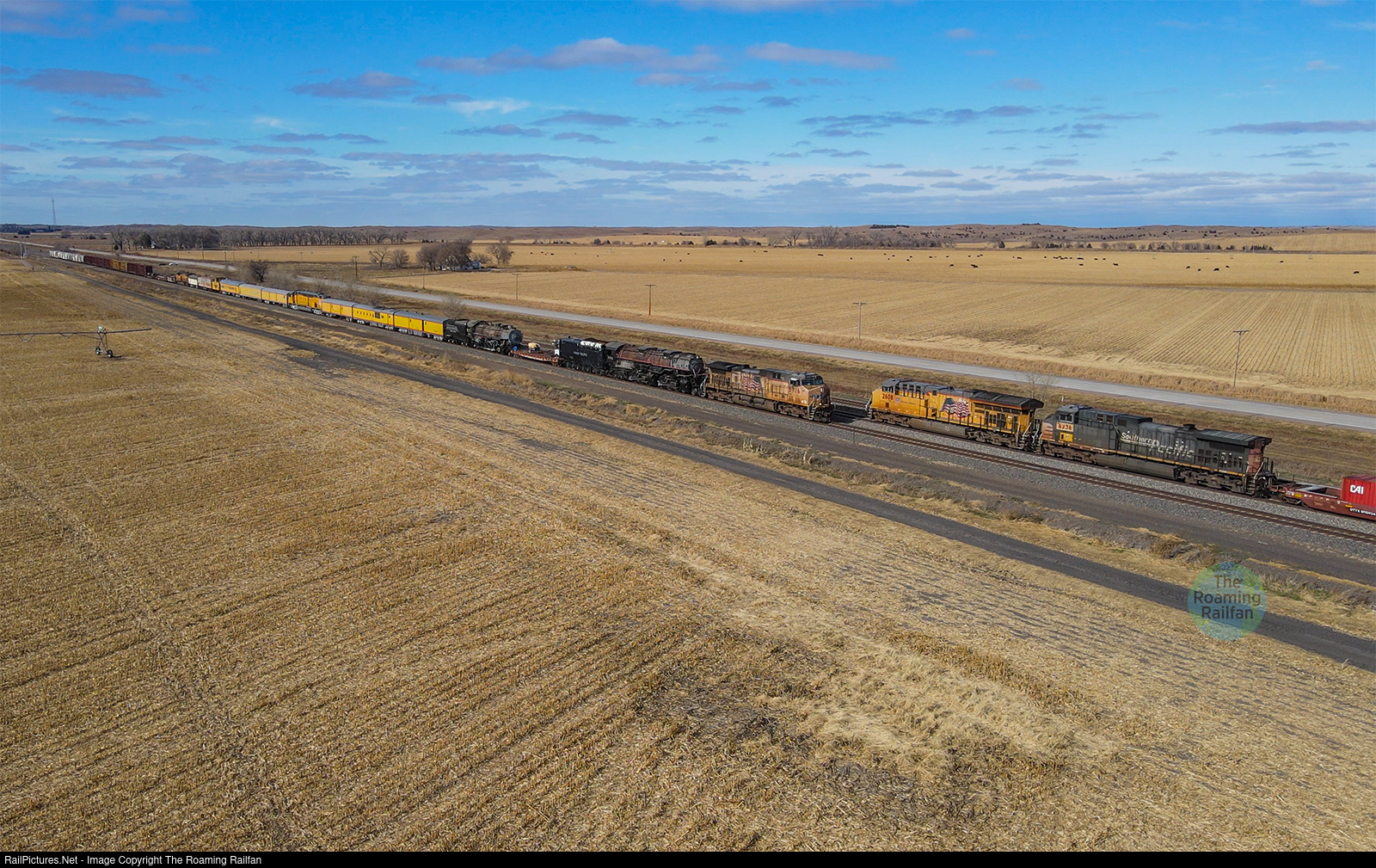 Union Pacific's Heritage Donation Special makes its way across Nebraska on its way to deliver Union Pacific Steam Locomotives 3985 and 5511, along with some passenger rolling stock, to their new home at Railroading Heritage of Midwest America in Silvis, IL.