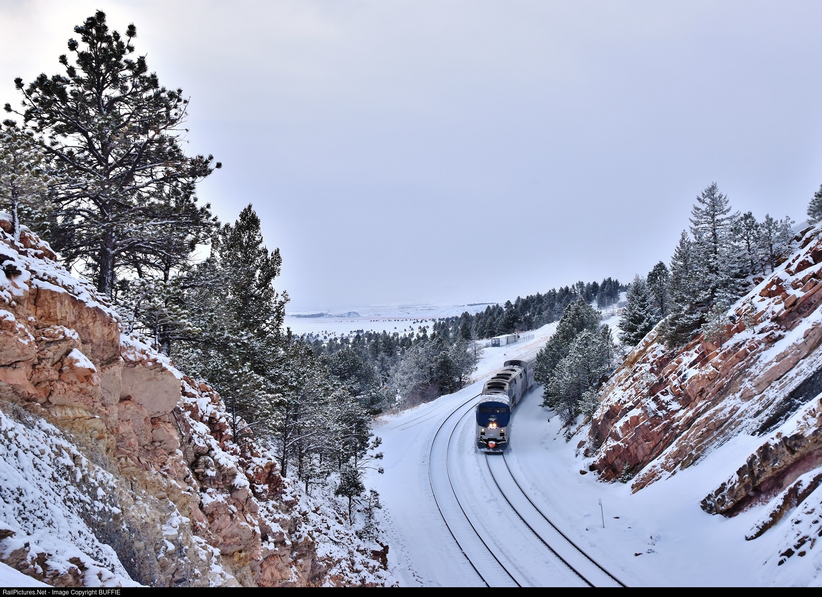 Snow is falling as the Winter Park Express Ski Train runs through Rainbow Cut at Plainview, Colorado.