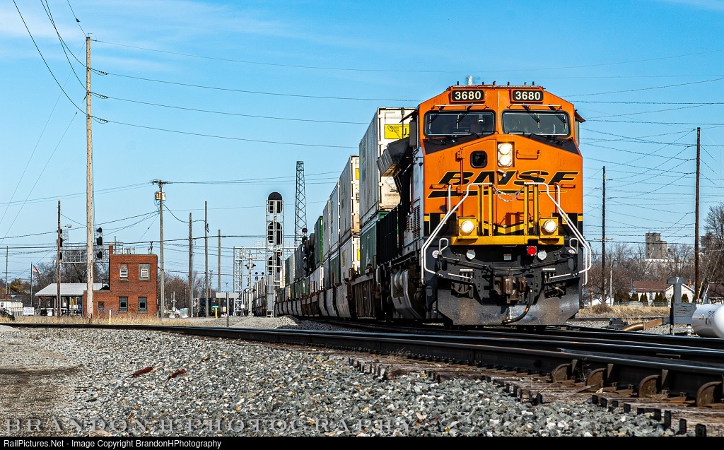 | Headed eastbound on the Sandusky District after working Sandusky Yard NS 266 led by BNSF 3680 a GE ET44C4 passes through Southwest Street in Bellevue Ohio, NS 266 is a daily intermodal from Chicago to Columbus Ohio. |