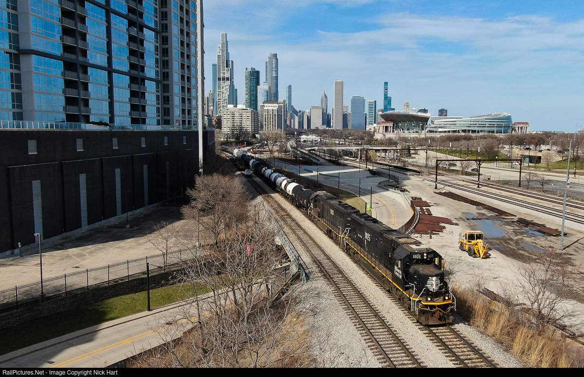 | IC 1025 and 1028 head south out of downtown Chicago as they lead the way of Kirk Yard bound L536. Soldier Field, home of the Chicago Bears, stands in the background. The NFL may be in the offseason, but Soldier Field will be shaking this summer when the Rolling Stones arrive on their Hackney Diamonds Tour. |