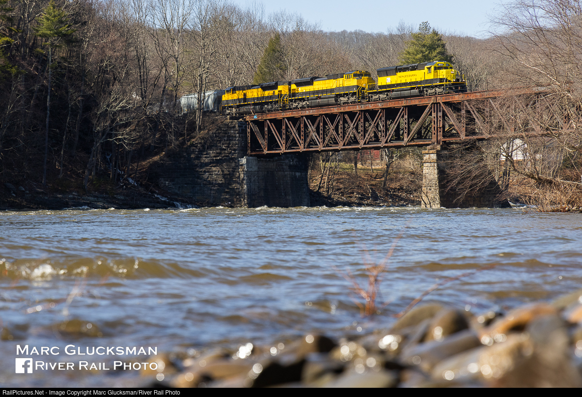 Down Low On The Delaware. Following the route of its namesake NY-100, NYSW SU-100 crosses the Delaware River from Millrift, PA to Sparrow Bush, NY. On this day, the train received a good move at CP Sparrow just up the track and on to the NJ Transit/MTA Metro-North Railroad Port Jervis Line to continue its journey. On Tuesday, March 12, 2024 the normally nocturnal New York, Susquehanna, and Western Railway SU-100 operated in daylight from Binghamton, New York to Ridgefield Park, New Jersey. Leading was NYSW SD33ECO 3012 (OLI, née-SP 8242, SD40T-2, EMD, 4/1980).