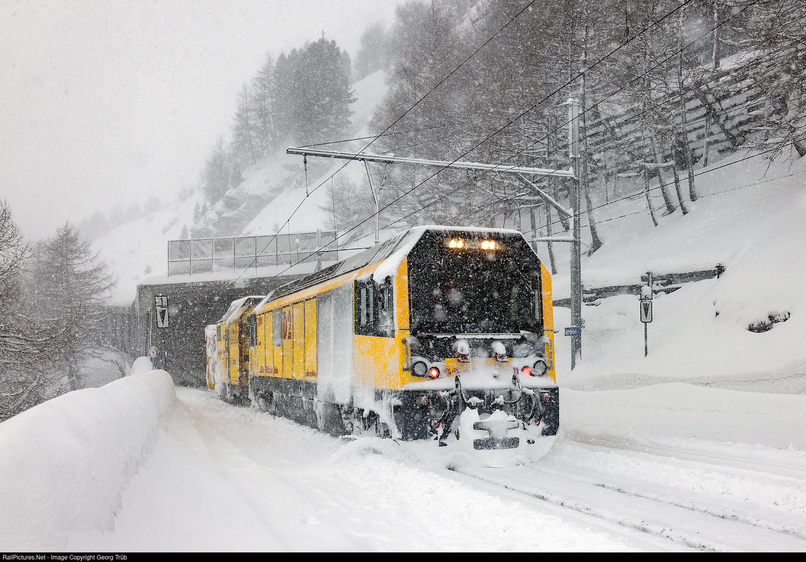 | Winter came back on the Berninaline in mid march. The Rhaetian Railway snow clearing train from Poschiavo is on its way back to the depot and arrives at Alp Grüm, coming from Ospizio Bernina. The diesel locomotive Gmf 234 # 02 pulls the snow blower Xrot mt # 95403. |