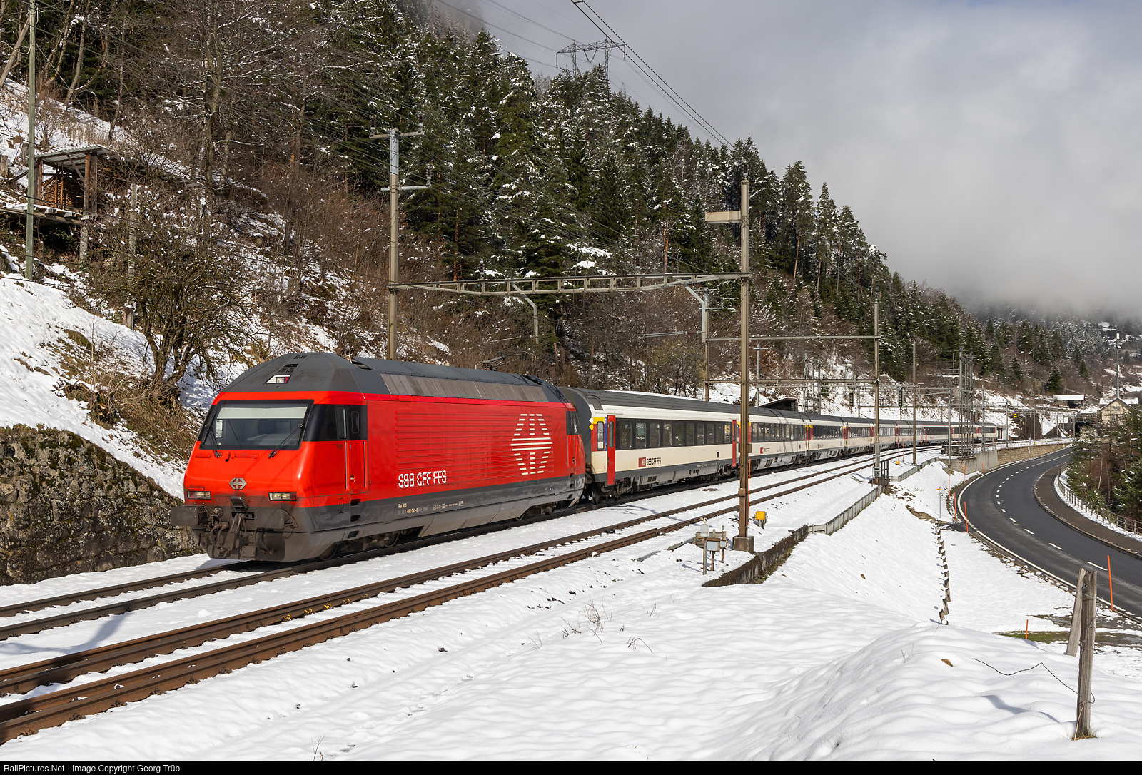 | Re 460 # 045 of the SBB pulls the IC 874 of the line IC2 from Lugano over the Gotthard mountain line to Zürich through Wassen. This is a push pull train with cars of type standard IV and Apm/Bpm. As the Gotthard Base Tunnel can still only be used on one lane for two thirds of its length since the derailment last August, all passenger trains and a few freight trains will continue to be diverted via the mountain route during the week. |