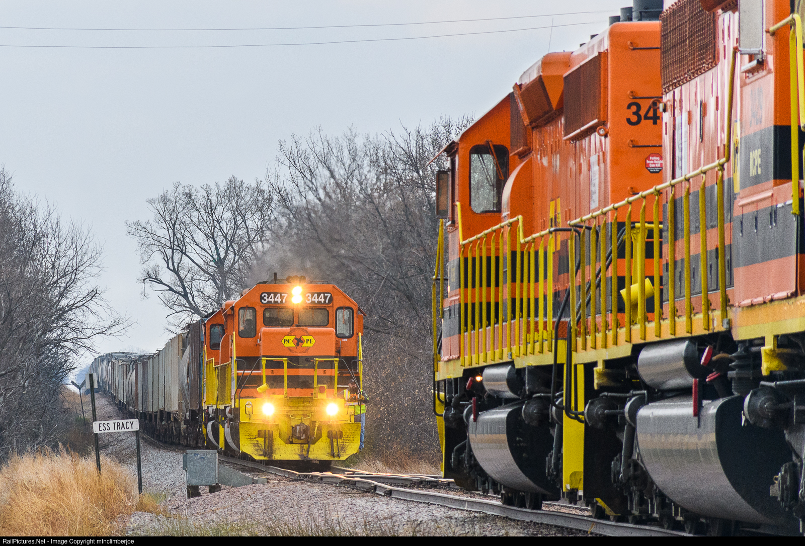 The Rapid City, Pierre, & Eastern's M MNAU pulls to a stop as it approaches Tracy, Minnesota at the ESS Tracy switch where they will meet the tied down M AUMN. The conductor is riding up to throw the switch into the siding for the westbound train, which will then proceed to Tracy and get back on to home rails.