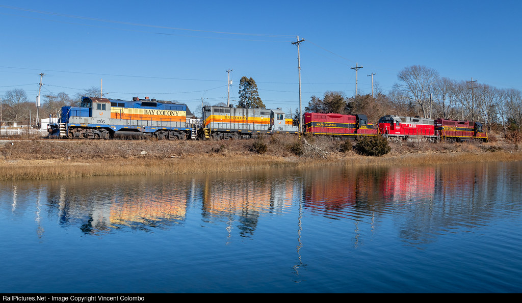 Mass Coastal 2012 leads LTEX 3815, MC 2006, BCLR 1706, and BCLR 1705 across Cohasset Narrows in Buzzards Bay, MA. Mass Coastal has recently acquired what was left of the Bay Colony Railroad, which began operations in 1982. Bay Colony operated on Cape Cod until Mass Coastal took over on 1/1/2008. 1706 and 1705 are once again on Cape Cod after a 16-year absence, although the fate of the two GP9s are unknown at this time.