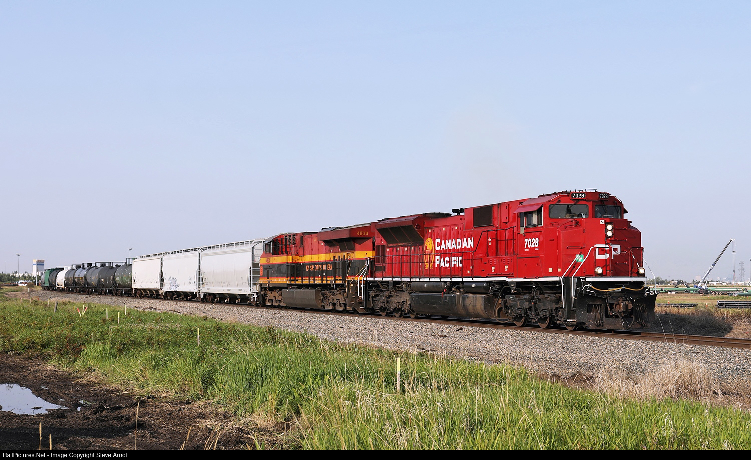 CP 7028 and KCS 4834 head east on the Scotford Sub.