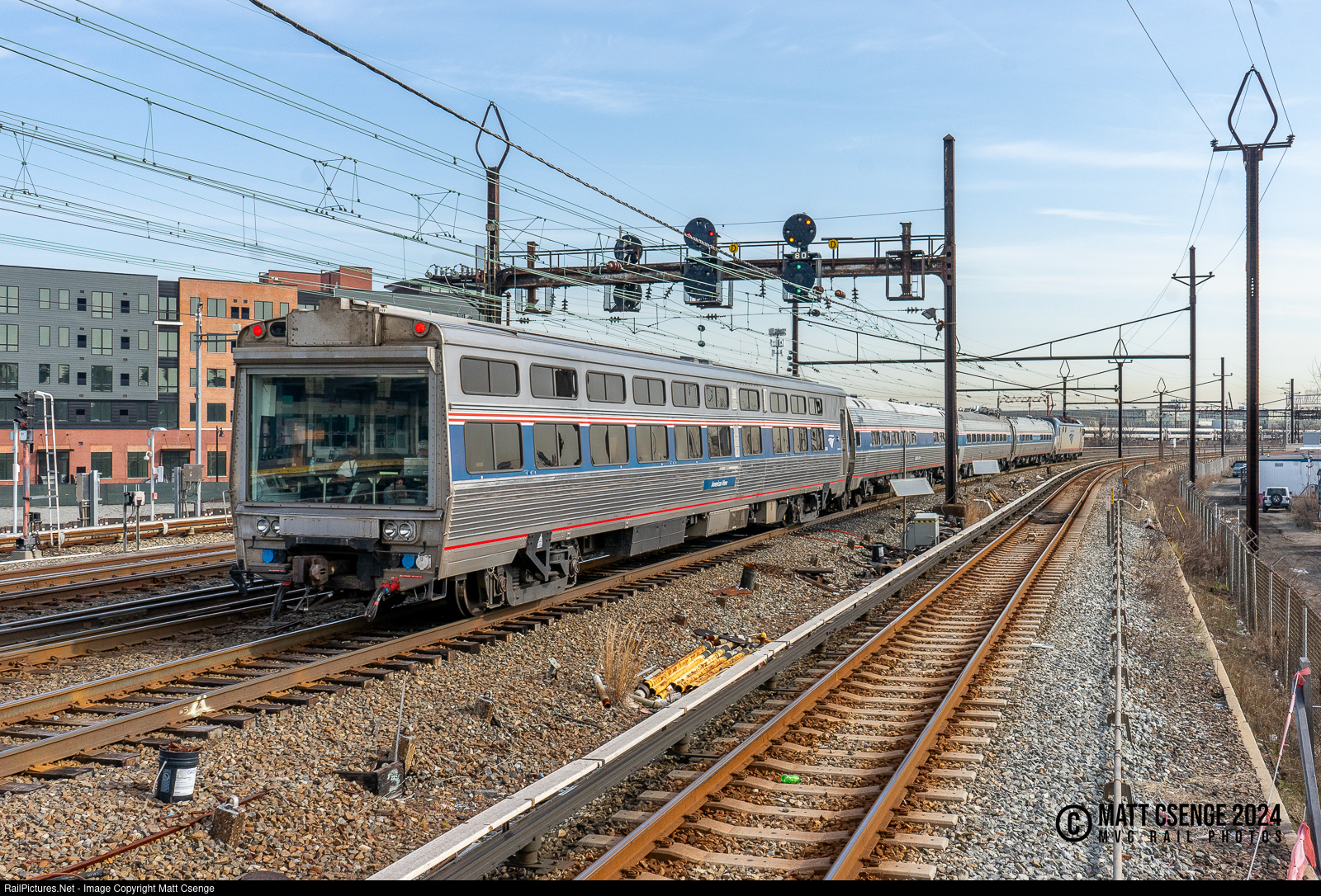 Viewing America. Amtrak Viewliner inspection car 10004, the "American View," brings up the rear of a geometry special seen heading east from Harrison Station. The full consist included: ACS-64 no. 630; First Class Conference Car 9800, converted from Metroliner snack bar coach 863; catenary inspection car 10005, converted from Metroliner Metro Club car 884; geometry inspection car 10002, the "Corridor Clipper;" and Viewliner inspection car 10004, the "American View."