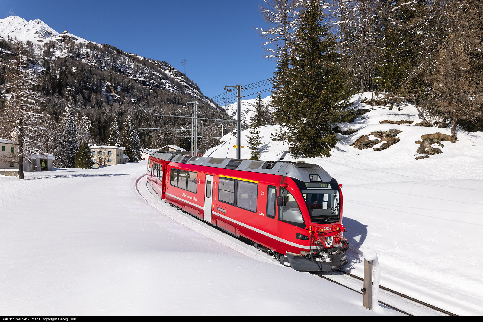 | "Allegra" ABe 8/12 # 3505 of the Rhaetian Railway is entering Cavaglia with train RE 1633 of the line RE9 from St.Moritz to Tirano. |
