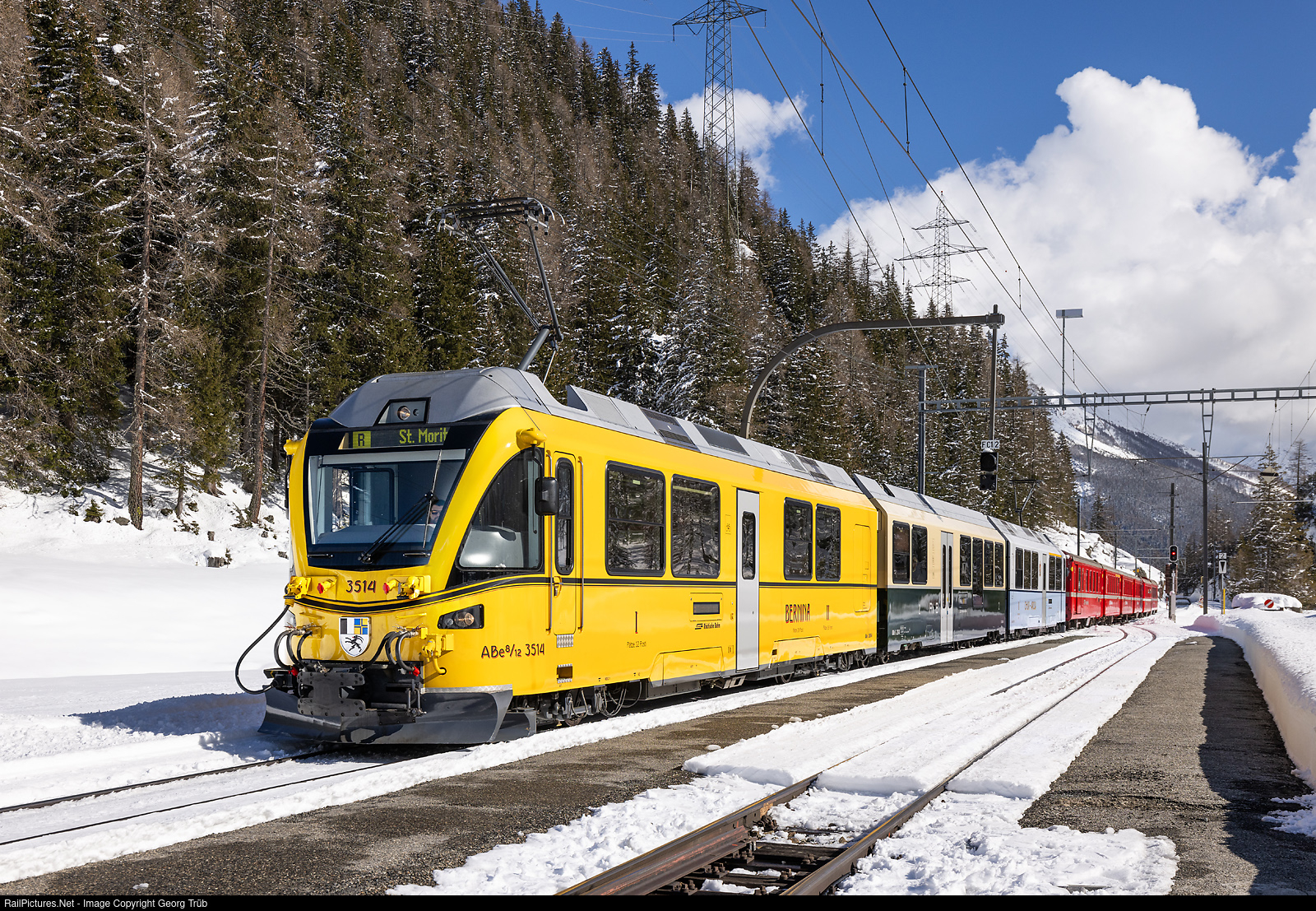 | "Ancestor train" (Ahnenzug) ABe 8/12 # 3514 of the Rhaetian Railway is entering Cavaglia pulling train 4656 of the line R19 from Tirano to St.Moritz. In front the yellow car reminiscent to the Bernina Bahn (BB), which merged with the Rhaetian Railway in 1943. The second car has the colores of the Rhaetian Railway at that time. The third car in lightblue/lightgrey is a memory to the Chur-Arosa Bahn (ChA) which merged with the RhB in 1942. |