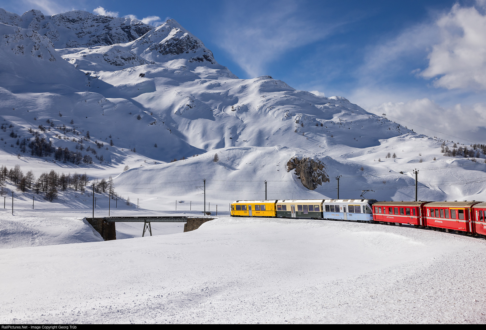 | Regional train 4656 of the line R19 from Tirano to St.Moritz is running down the Bernina line between Ospizio Bernina and Bernina Lagalb, crossing the upper Ova da Bernina bridge. Pulling is the "Allegra" ancestor train ABe 8/12 # 3514 in the colors of the former Bernina Railway (yellow), the Chur-Arosa Railway (lightblue/lightgrey) and the Rhaetian Railway in the 1940/1950' (green/cream). |