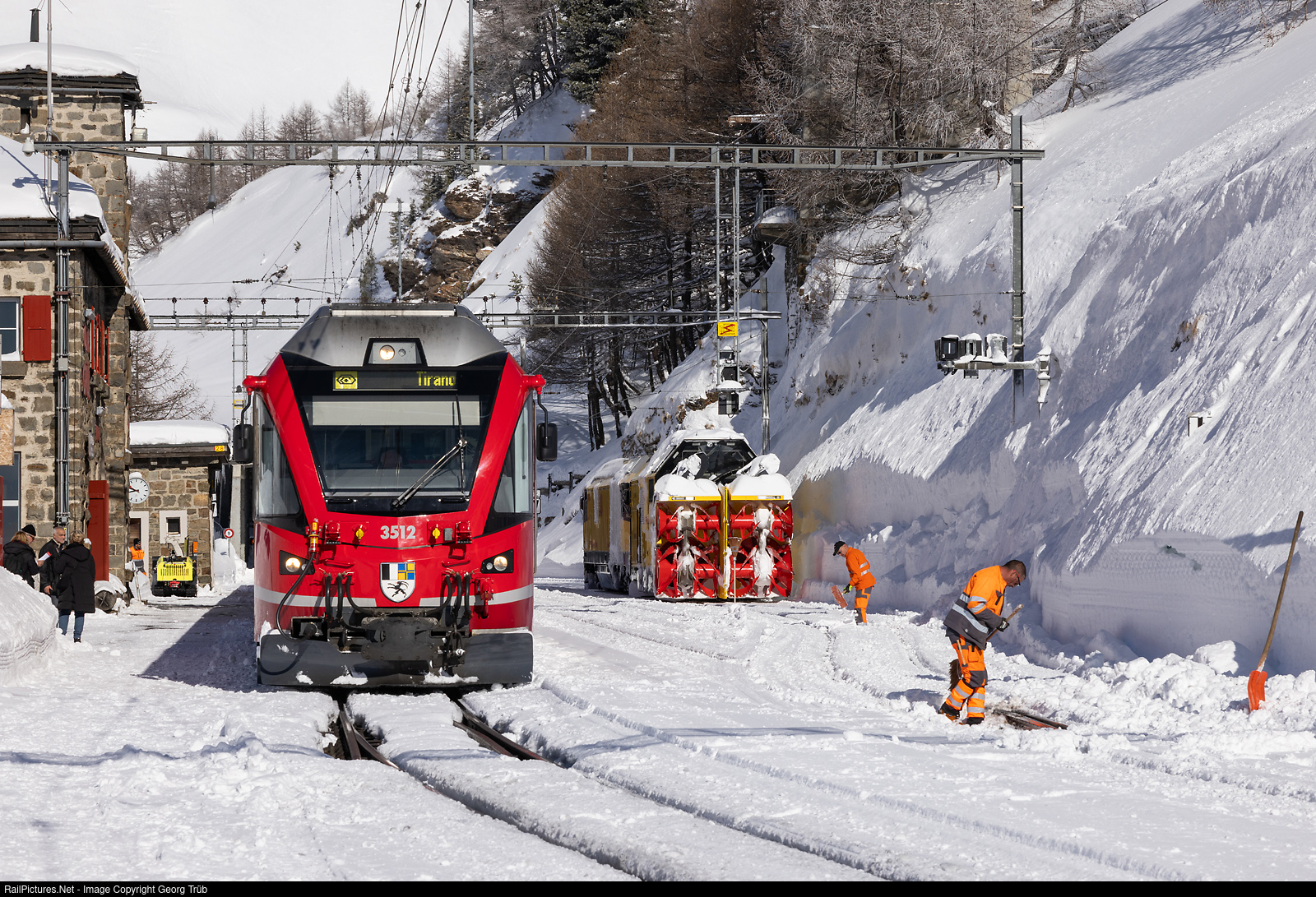 Despite the most modern means of clearing snow and heating the points, some manual labor remains. Train RE 1617 of the line RE9 from St.Moritz to Tirano with "Allegra" ABe 8/12 # 3512 has arrived at Alp Grüm, while the snow blower Xrot mt # 95404, pushed by diesel locomotive Gmf 234 # 03, takes a short break.