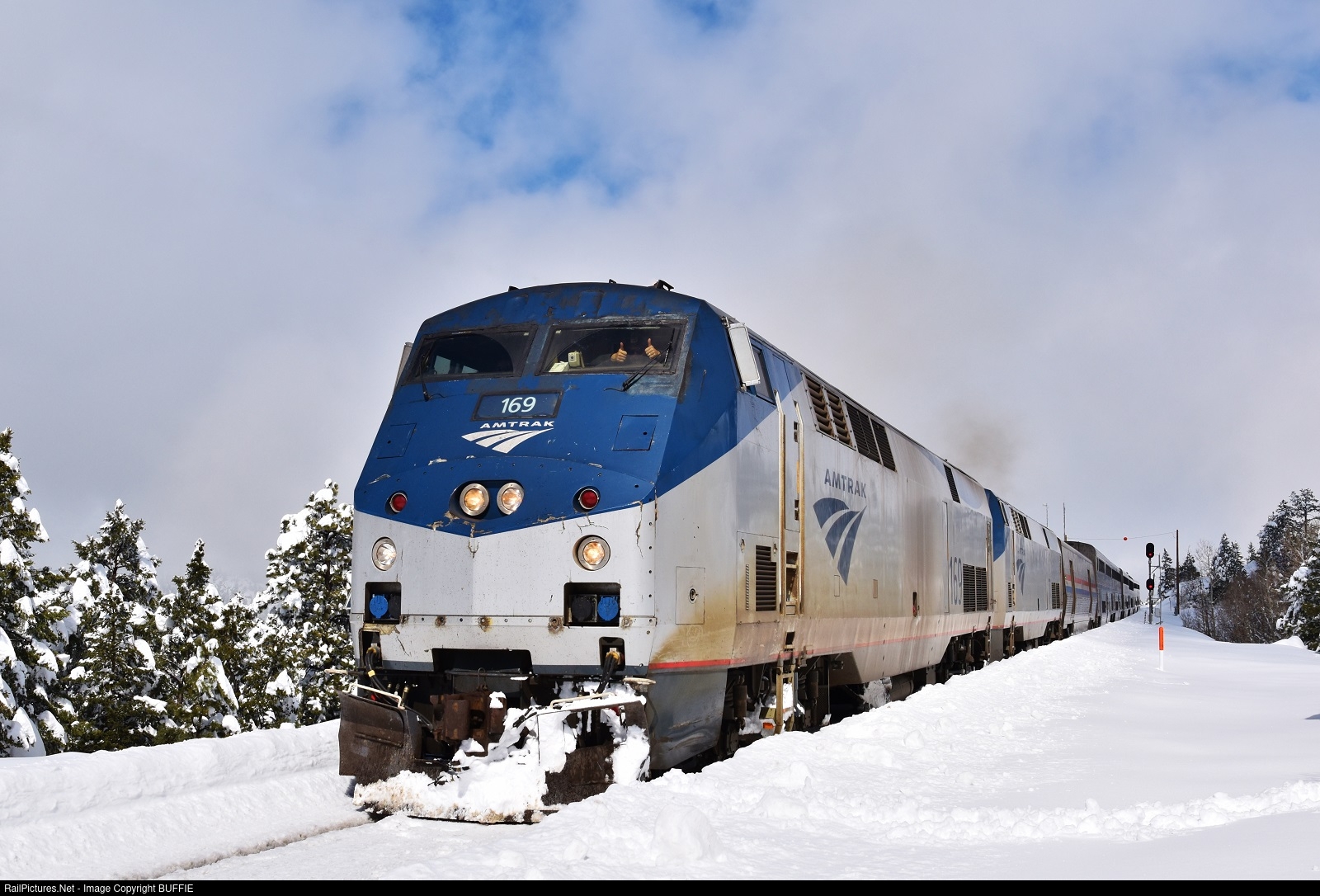 | A crewmember gives two thumbs up as the California Zephyr runs through Crescent, Colorado, where four feet of snow fell overnight.