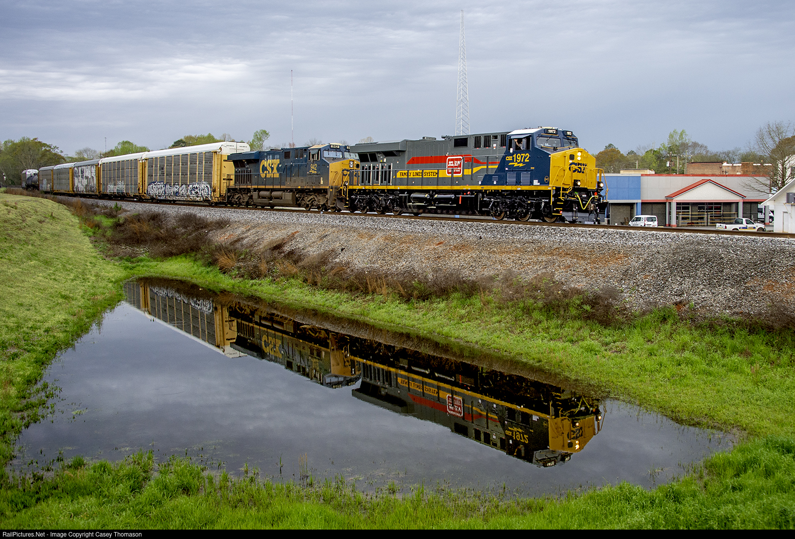 | CSX's "Family Lines" heritage unit leads M60216 south through Montezuma, Georgia, on St Patrick's Day. |