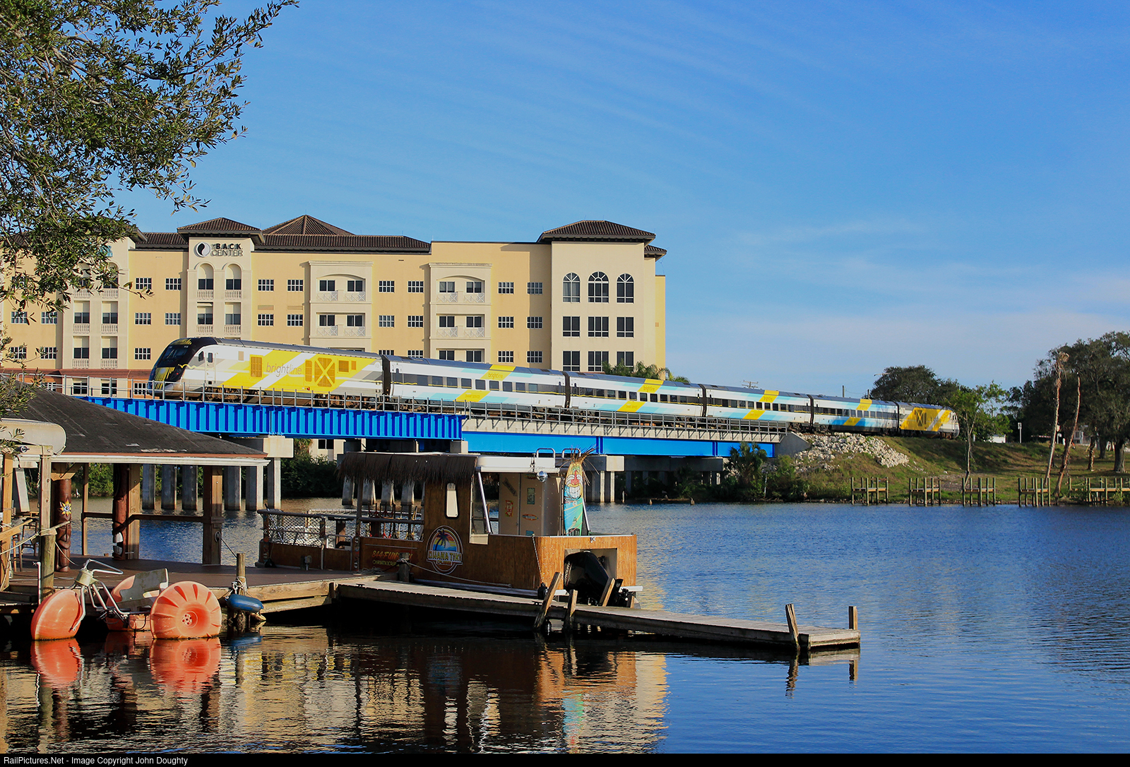 | A peaceful afternoon is briefly interrupted by the sound of Brightline 113 as it races north across the Crane Creek bridge in downtown Melbourne, Florida. |