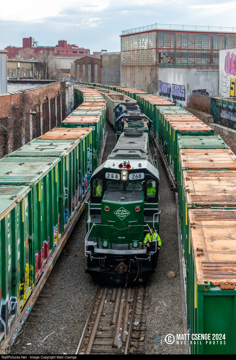 New York & Atlantic Railway GP38-2 no. 268 is seen leading train RS-40 between strings of cars on the Bushwick Branch on March 17, 2024. This part of Brooklyn's Williamsburg neighborhood is very dense with industry, through which the railroad cuts a narrow swath. This was the first run of 268 following rebuilding and repainting into the most modern NYA paint scheme. |