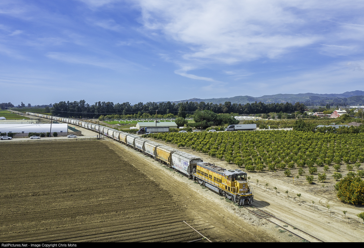| Crossing over Briggs Road between the orchards and freshly plowed fields of the Heritage valley, Sierra Railroad RB20bBD No. 2666 with a movement of 50 Covered Hoppers that were stored in the Santa Paula yard. They are bound for Saticoy for interchange with Union Pacific and another storage site.