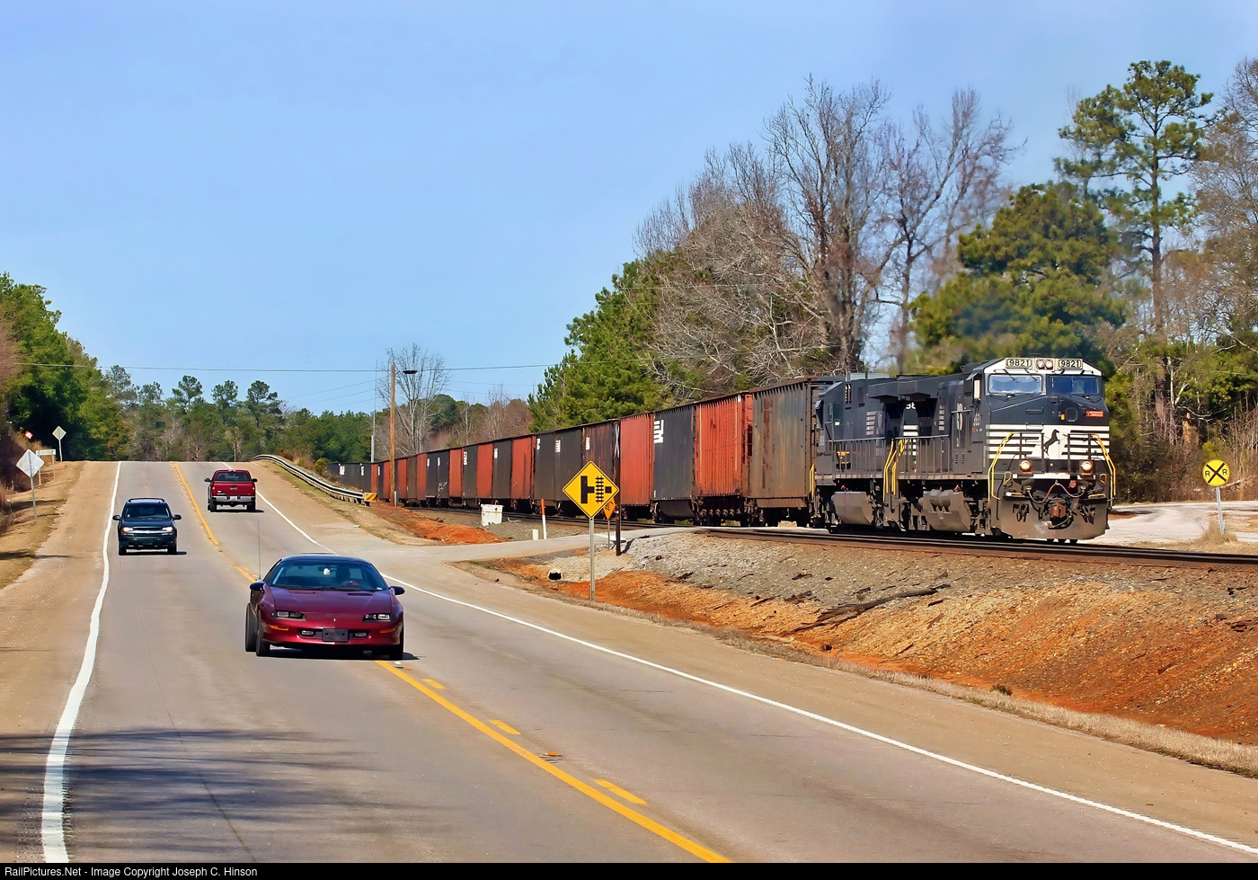 | Norfolk Southern 67E, an empty wood chip train, takes the siding in Simpson, a small hamlet in Fairfield, South Carolina. |