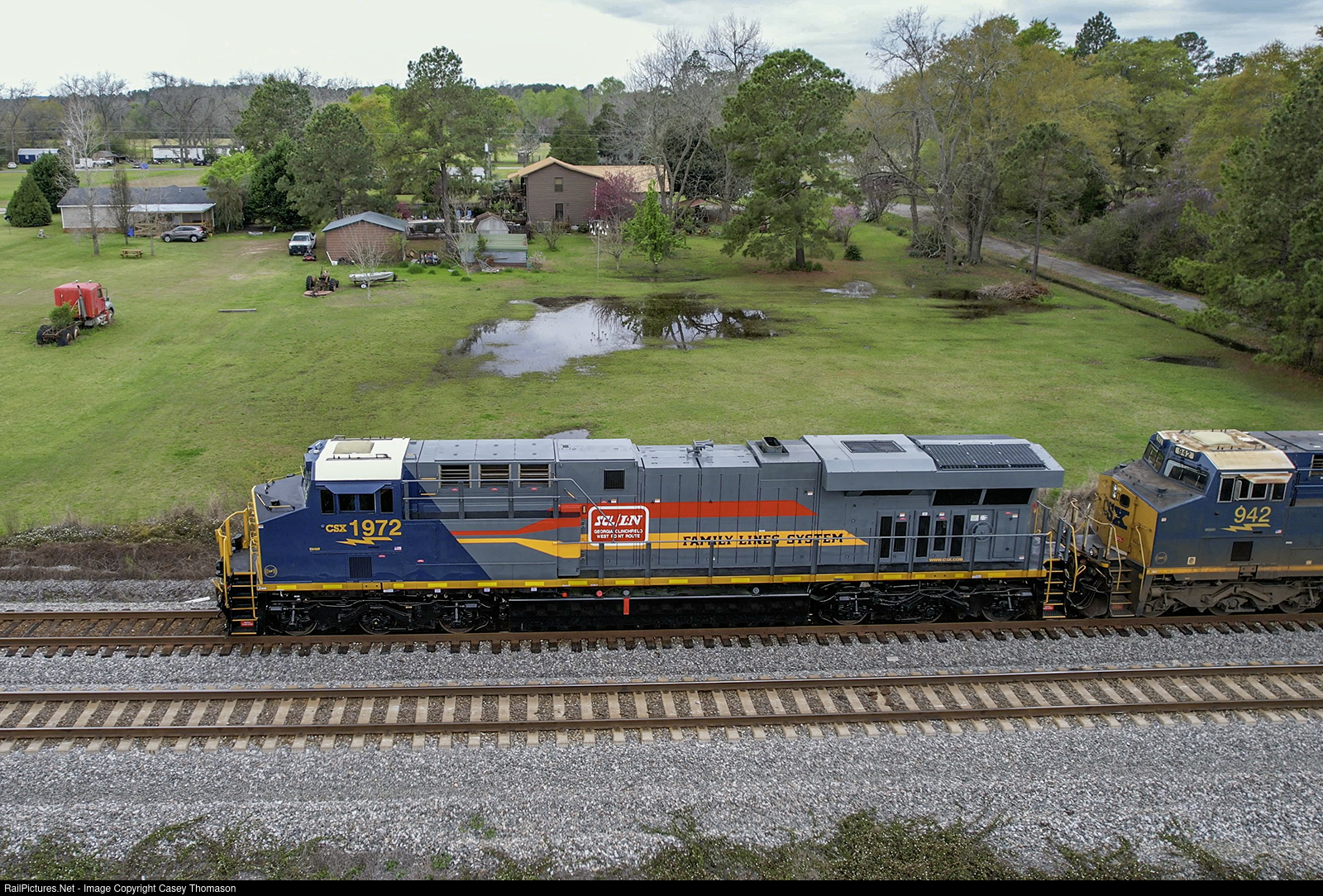 | CSX's "Family Lines" heritage unit leads M60216 south through Rebecca, Georgia, on St Patrick's Day. |
