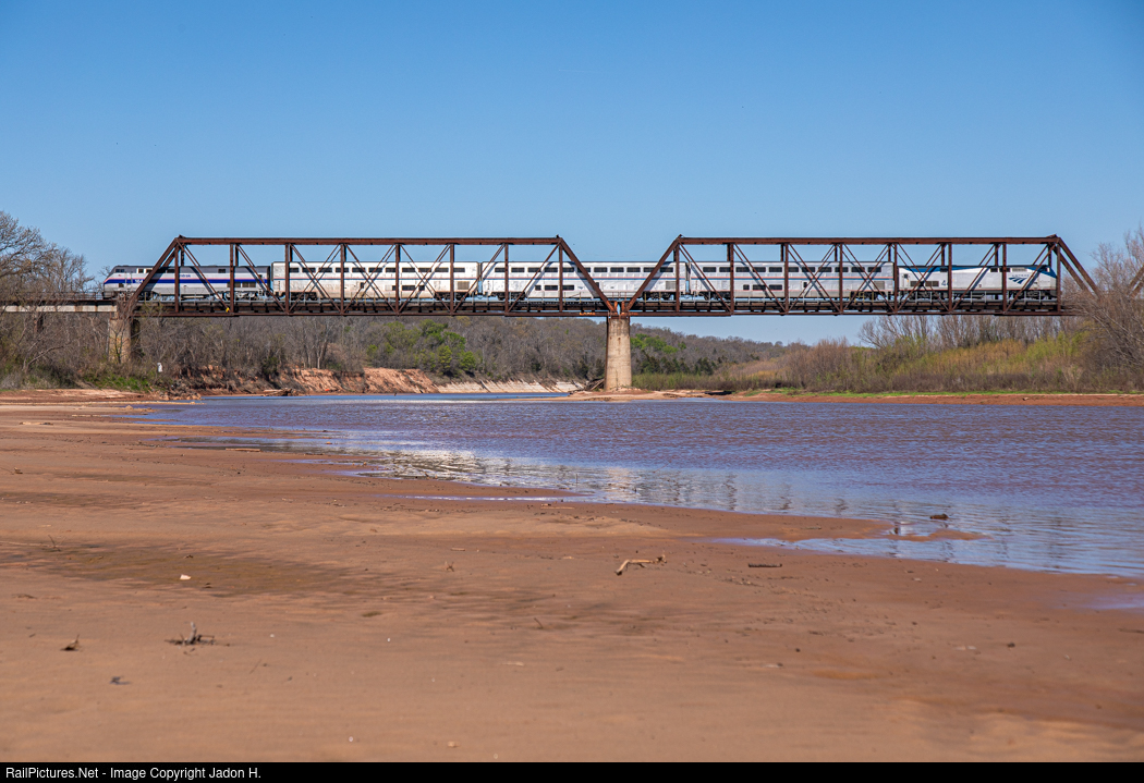Amtrak's phase 4 heritage unit leads the Heartland Flyer across the Red River into Texas