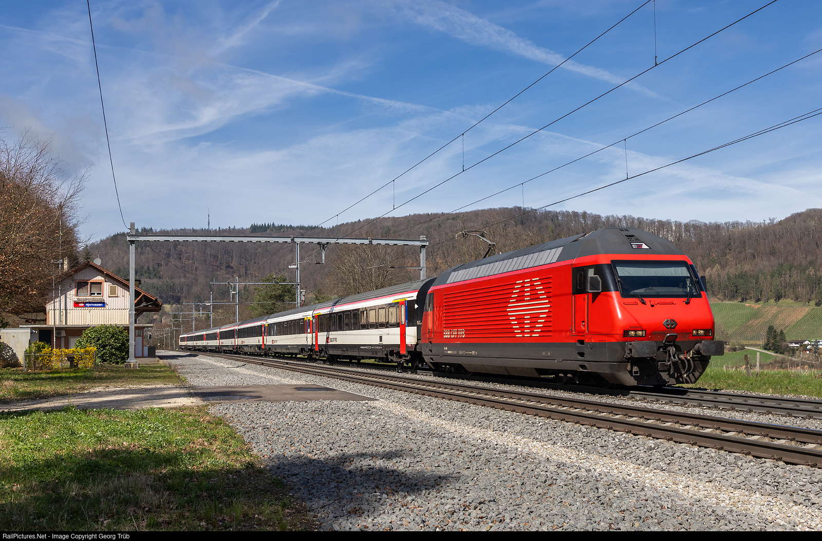 | Re 460 # 037 of the SBB pulls the push-pull train with standard cars type IV and two Bpm cars through Hornussen on the Bözberg north ramp. Ths is IR 1971 of the line IR 36 from Basel via Rheinfelden-Stein-Säckingen-Frick-Brugg-Baden to Zürich. The station building, which still bears the official SBB station sign, dates back to 1875. Trains have not stopped here since 1993, but the platforms were only removed in 2023. |