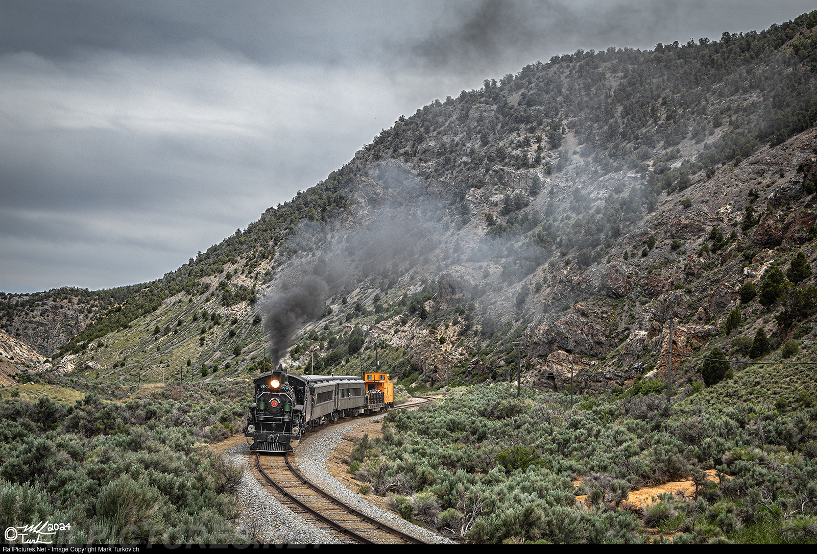 Nevada Northern 81 works its passenger train up the grade through Robinson Canyon on an overcast June afternoon.