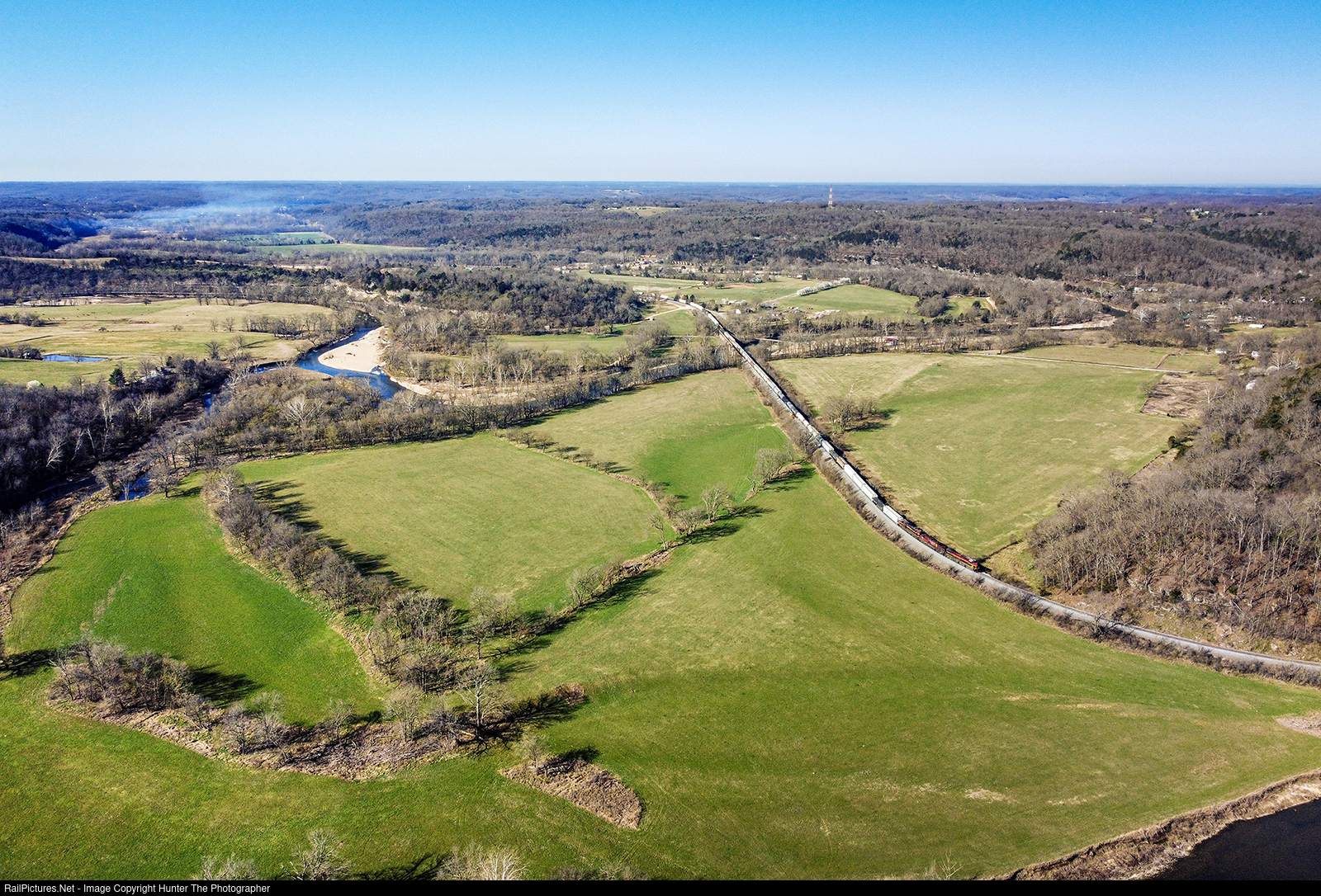 | Rolling through the community of Ginger Blue on a beautiful Sunday, March 10, 2024 morning, a CPKC manifest train heads north past the Elk River in southwestern Missouri.