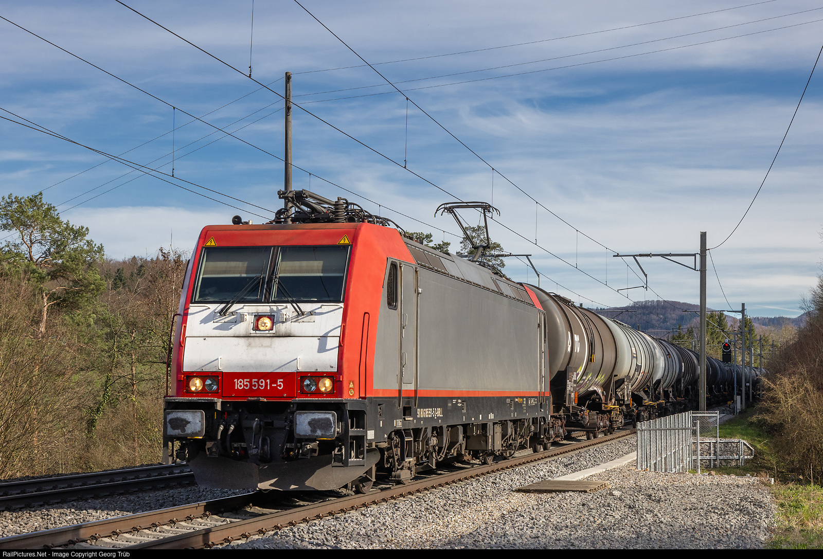 | Bombardier TRAXX F140 AC2 185 # 591 of the Beacon Rail, rented to LTE Schweiz Gmbh, pulls the empty tank car train 48502 from Wil freight yard via Winterthur-Kloten-Regensdorf-Bözberg-Basel to Grosskorbetha/Germany, on the Bözberg north ramp at Hornussen. |