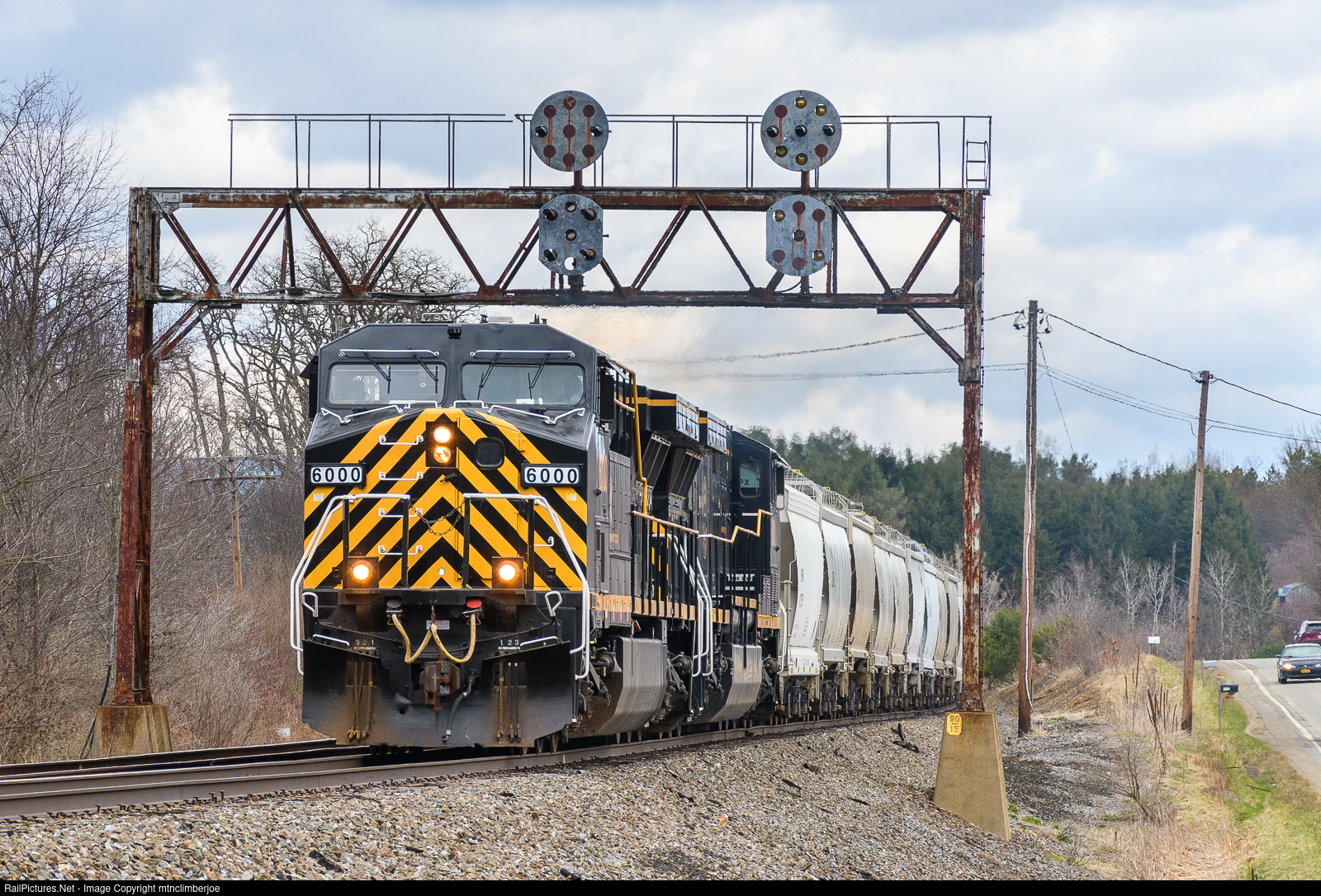 With a pair of AC6000's leading the way, the WNYP's OL-2 job rolls under the old PRR signal bridge at the north end of the Eldred siding in Eldred, Pennsylvania just south of the state line. After putting their train together at the yard in Olean, the crew is bringing 20 loads of frac sand down to the transload in Emporium.