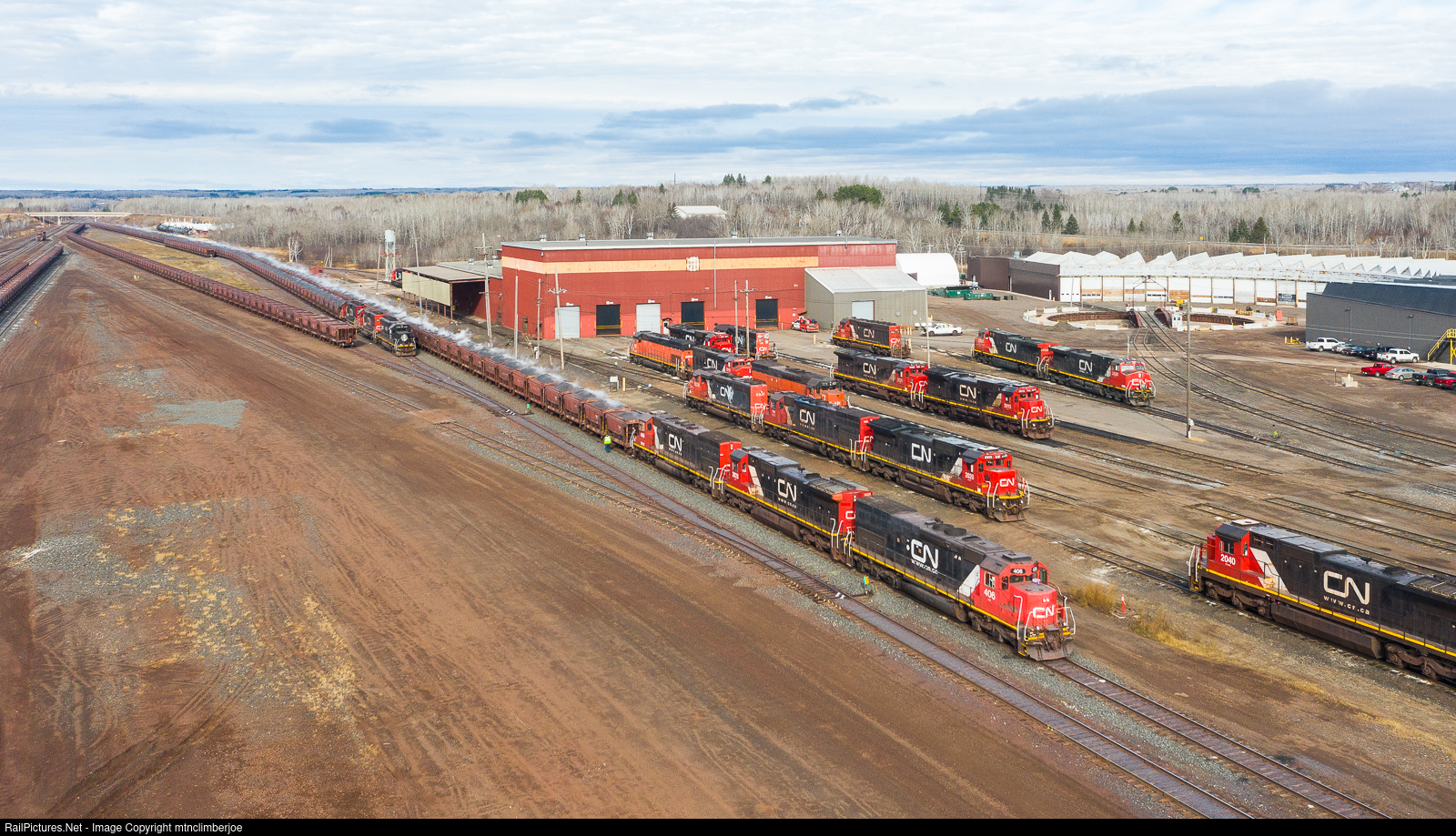 With a train of steaming pellets from the Fairlane Taconite Plant in tow, DMIR 406 leads CN U71781-04 as it slowly makes its way into the yard at Proctor, Minnesota to tie the train down where it will wait for a yard crew to take it to the docks. In the background is the Proctor diesel shop and roundhouse, filled with the SD40's and C40-8's used in ore service, along with a pair of bigger GE's that came in from a road train.